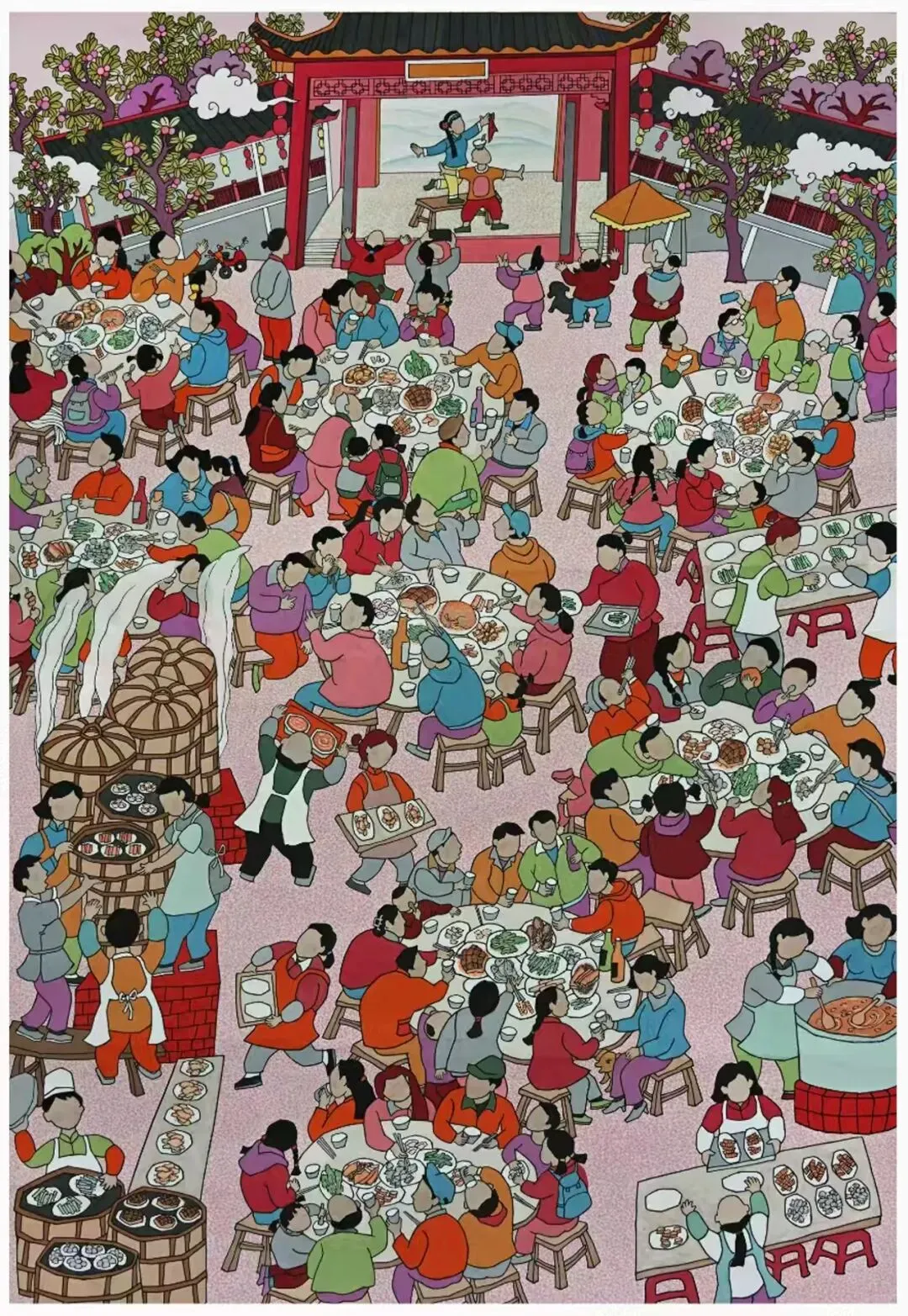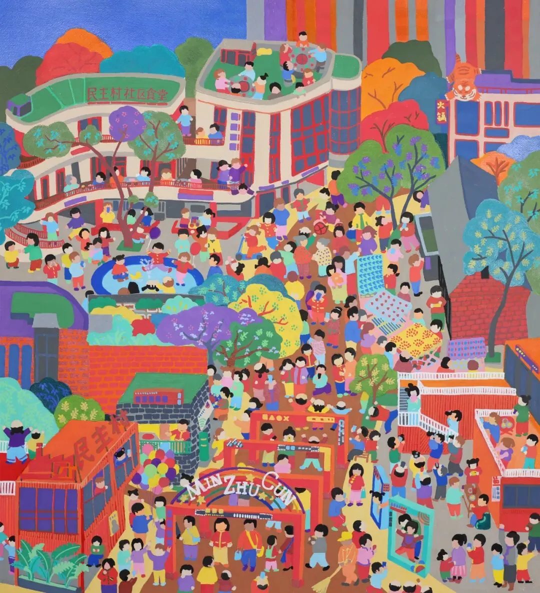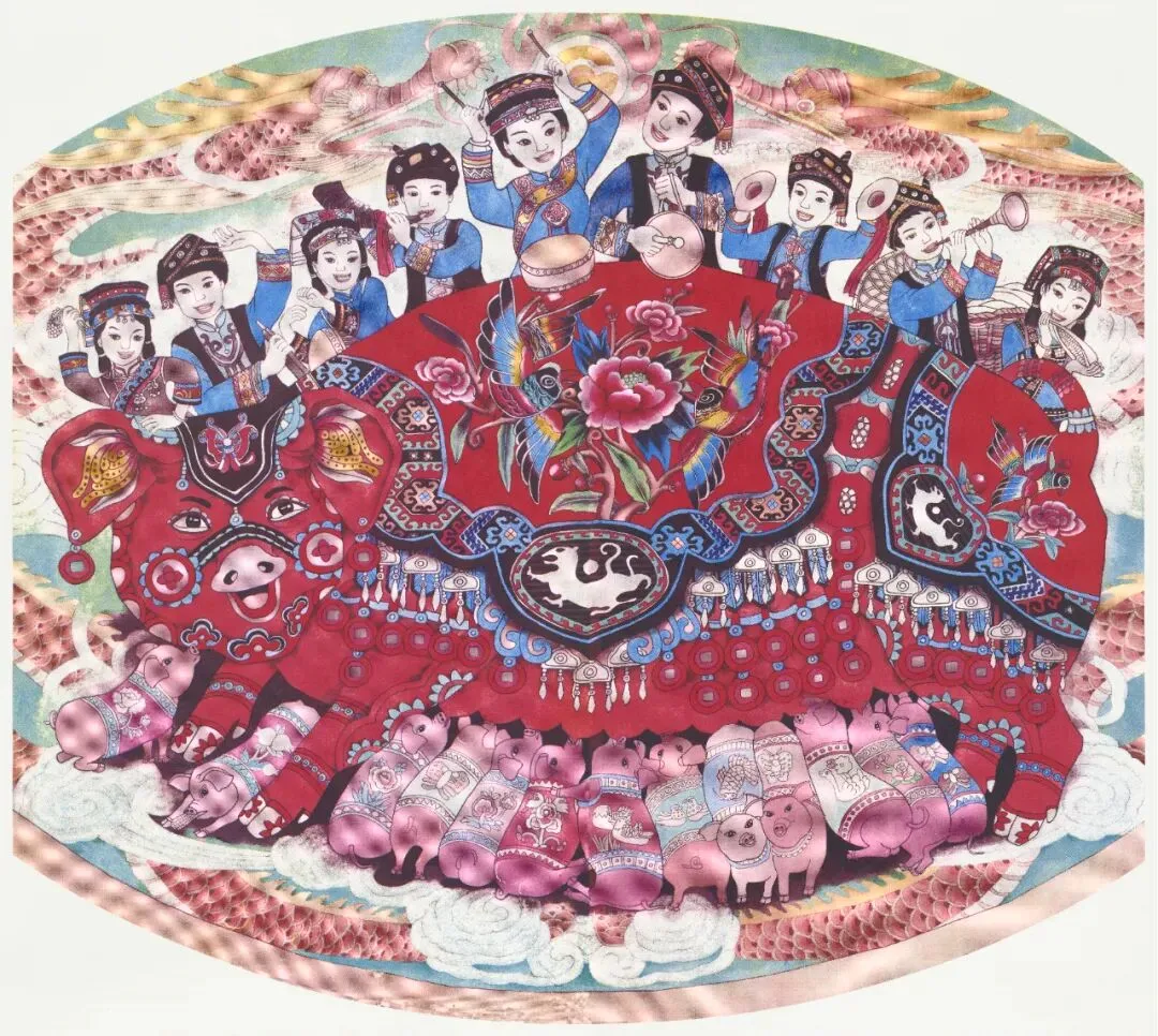 中国农民画并非“横空出世”。它深植于剪纸、刺绣、皮影、雕刻、年画等民间母体艺术,是稻麦气息与手工温度的当代延伸。20 世纪 50 年代,江苏邳县(今邳州市)、河北束鹿(今辛集市)、陕西户县(今西安鄠邑区)等地率先把“拿锄头的手”引向纸面,由此掀起一场持续数十年的农民画浪潮。红高粱、金麦浪、鸡鸣犬吠、袅袅炊烟……从未进过美院的作者,以朴拙之形、炽热之色,记录下乡土中国的呼吸与心跳。