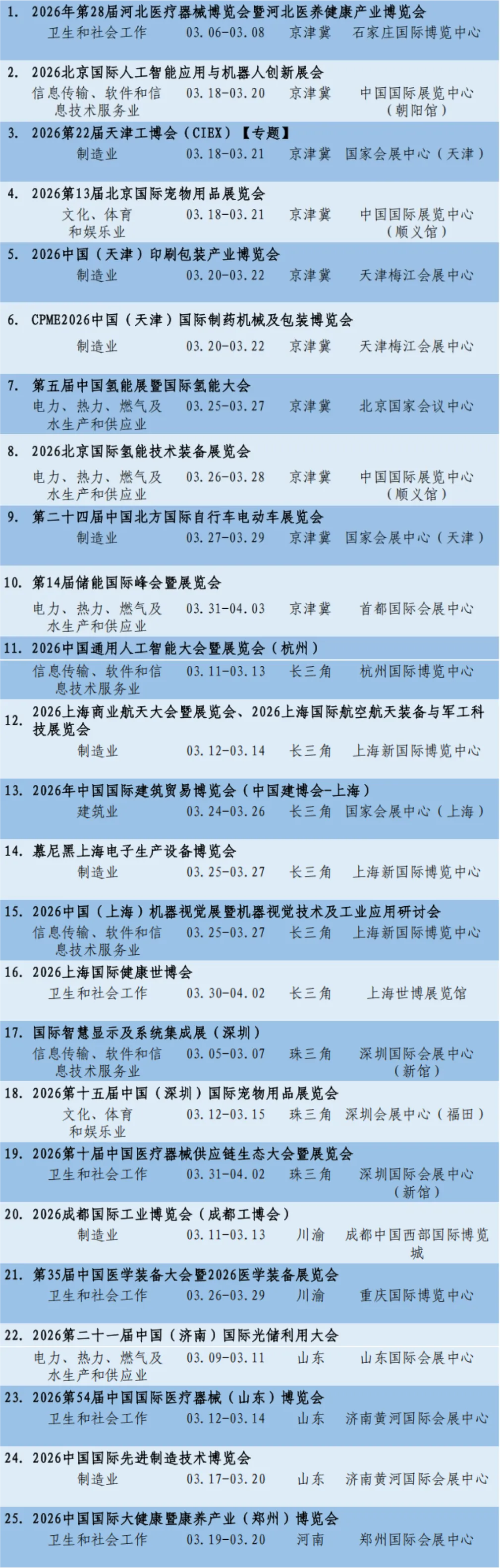 3月份,全国各地计划举办各类行业会展活动共计94场,其中重点活动25场,包括:京津冀地区10场、长三角地区6场、珠三角地区3场、川渝地区2场。会展主题涵盖技术服务、能源电力、高端制造等多个产业领域,具体如下: