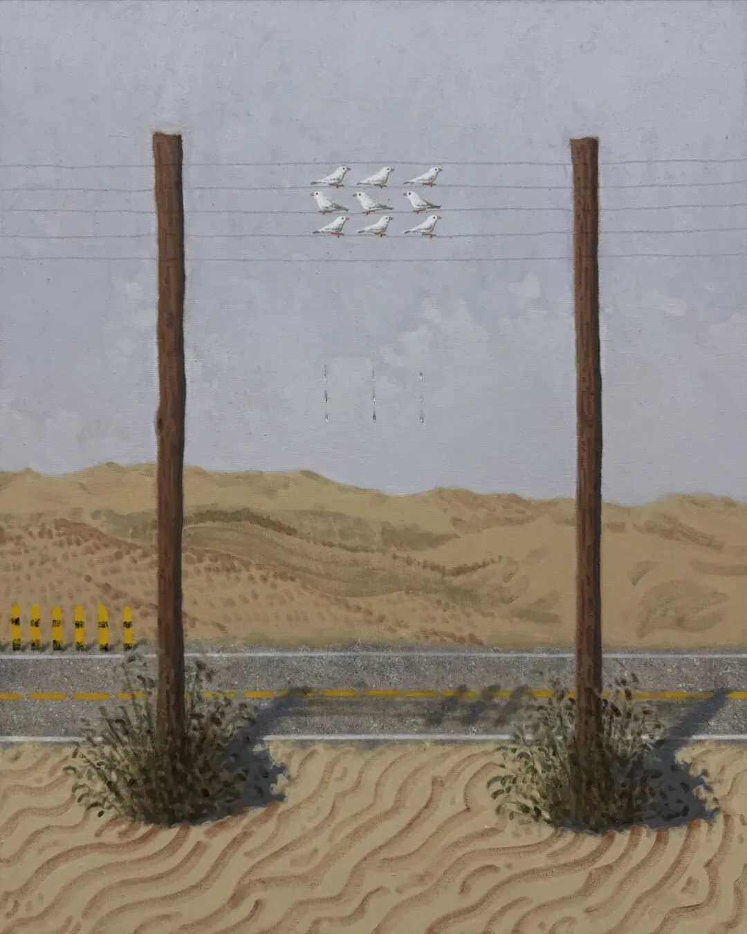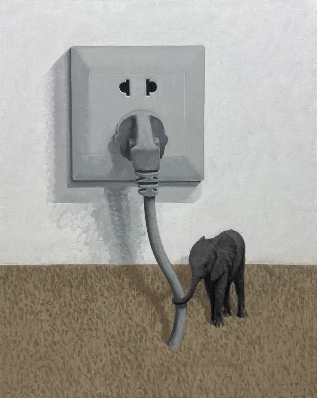 早期受到涂鸦文化的影响(尤其是模板涂鸦在速度、直接性与图像清晰度上的特征),使陈一鸣始终保持着对具象形态与视觉符号的敏感。回到系统性的绘画创作后,他选择从“内容”而非技巧入手,重新调动在涂鸦与定格动画创作中积累的经验。他以灰阶与低纯度色彩为主,严格控制笔触节奏与明暗对比,构建出清晰而节制的视觉秩序。