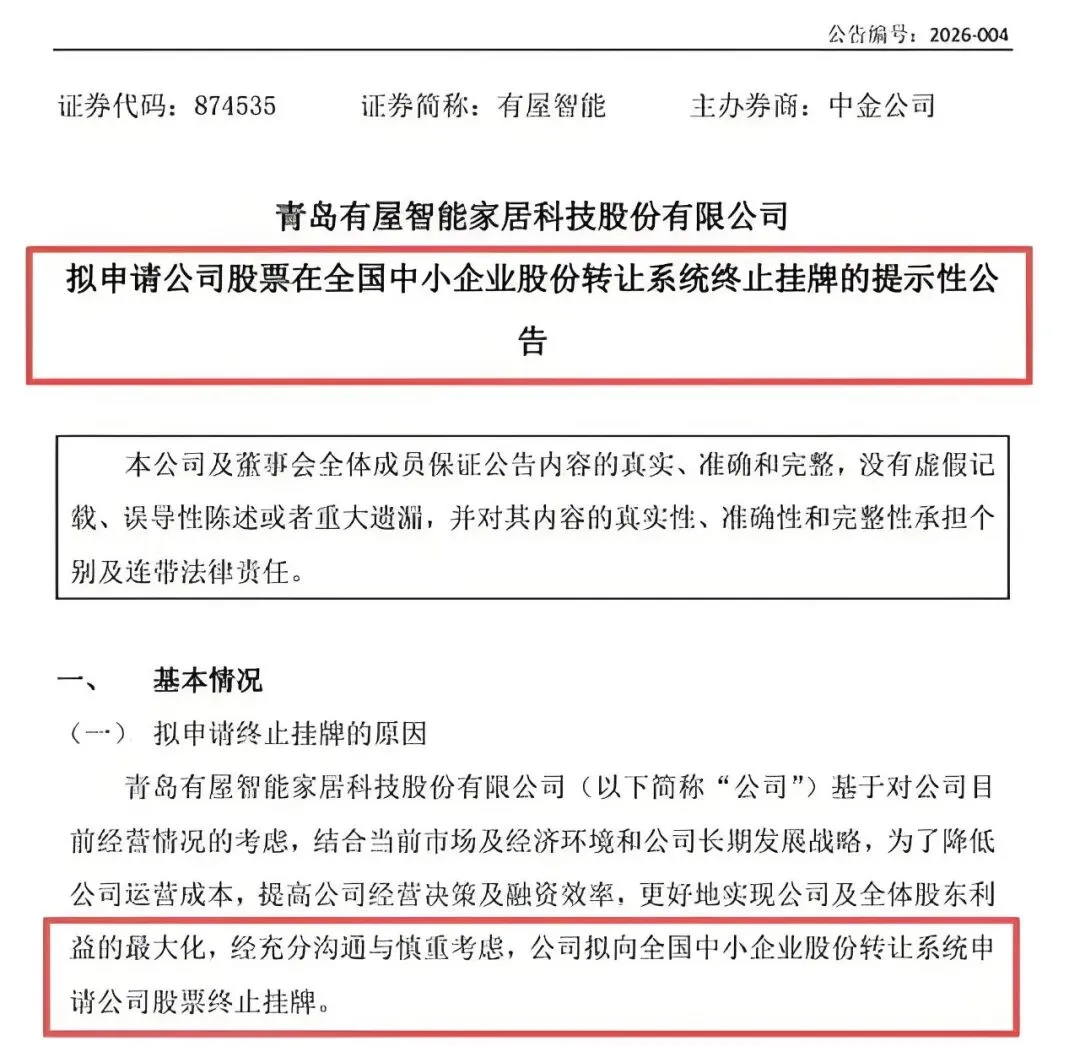 2月9日,有屋智能发布公告称拟申请新三板终止挂牌。作为海尔旗下公司,有屋智能于2024年9月在创业板上市未果后正式登陆新三板,旗下拥有博洛尼、海尔家居等品牌。其表示,终止挂牌是基于对公司目前经营情况的考虑,为了降低公司运营成本,提高公司经营决策及融资效率。从创业板折戟到新三板摘牌,有屋智能的资本之路走得颇为坎坷。
