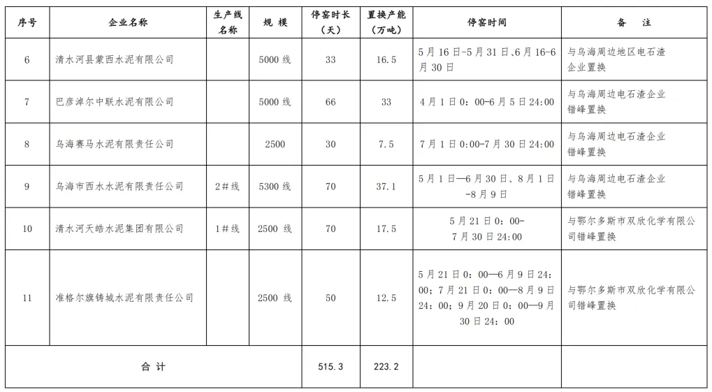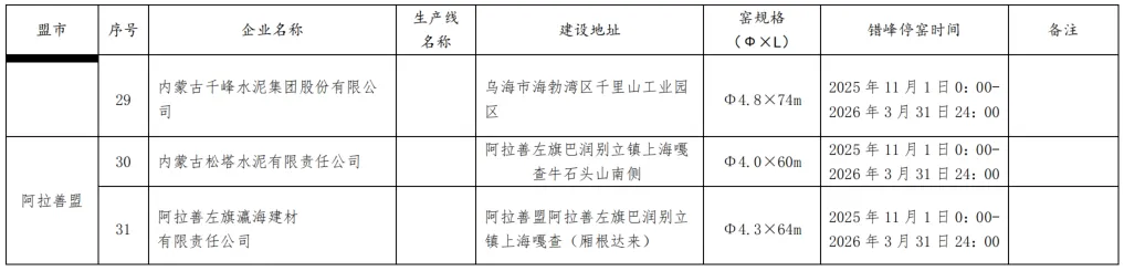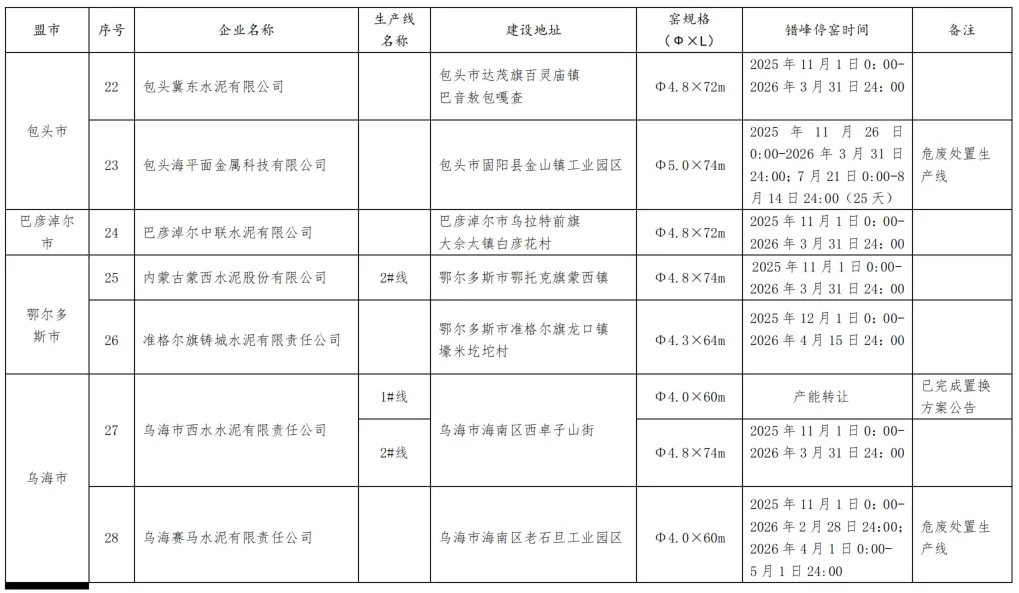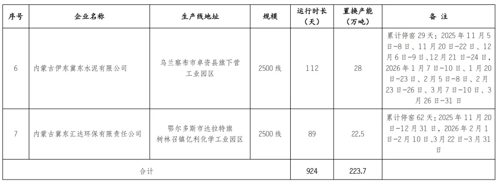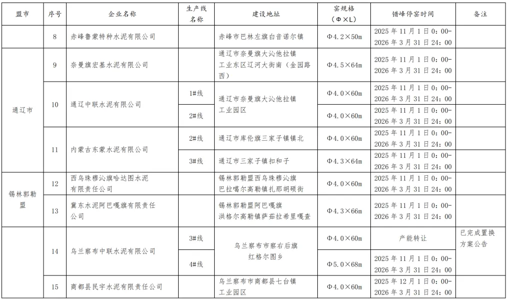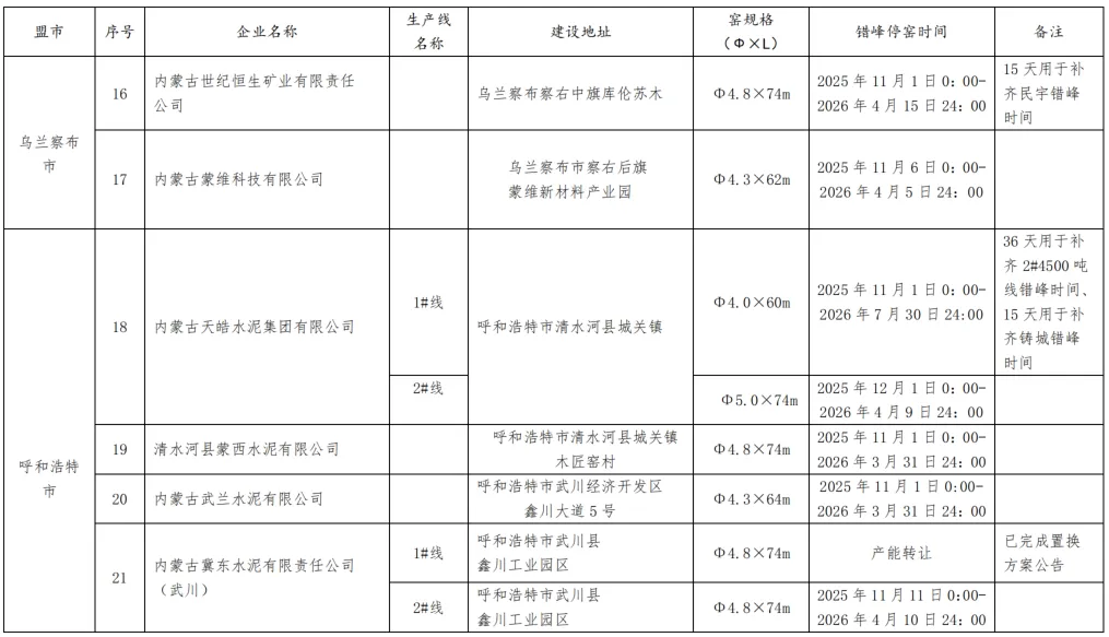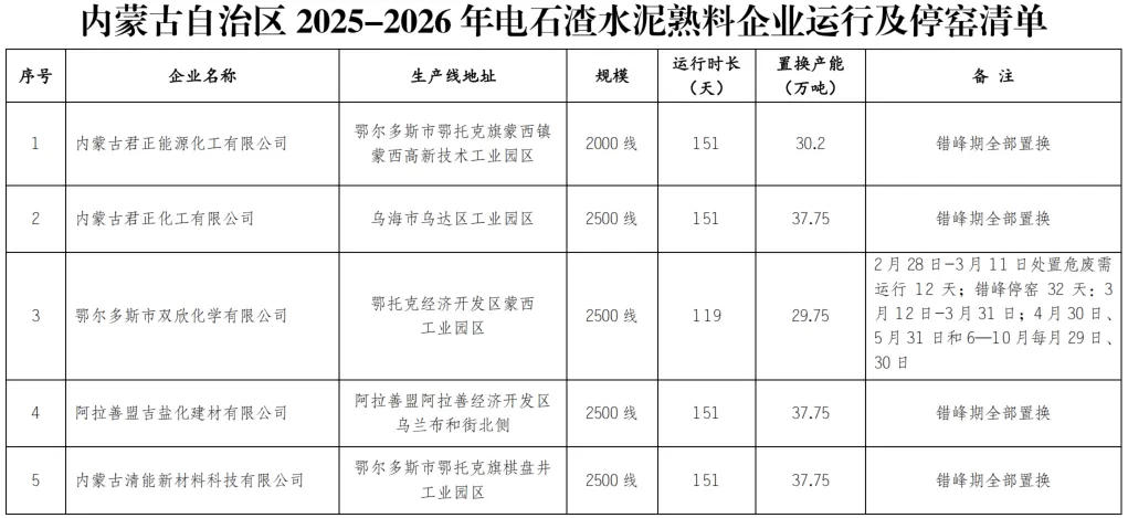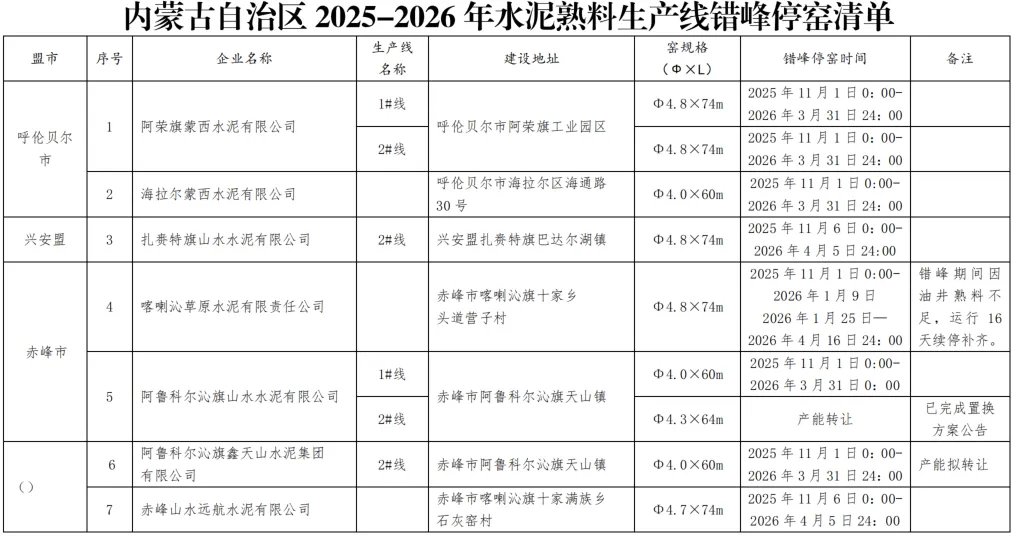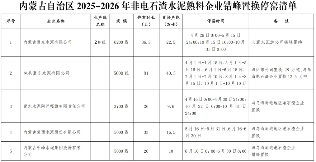 2025-2026年水泥熟料生产线错峰停窑及错峰置换清单如下: