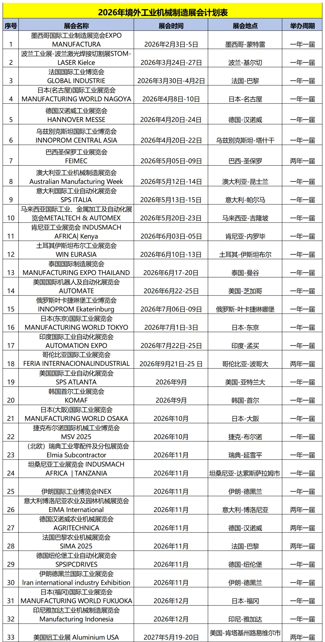 2026年全球工业机械制造展览会计划表