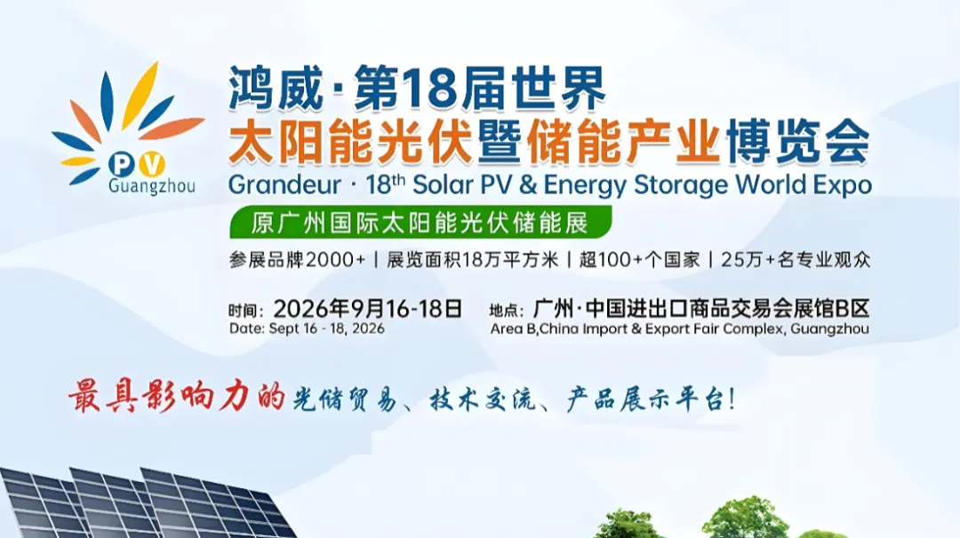 中国光伏产业持续创新和技术进步,促进了光伏行业良性的发展,为全面推进分布式光伏发电及光伏电站建设。由广东省太阳能协会、广东省对外经济合作企业协会、广东省粤港澳经贸合作促进会、广东鸿威国际会展集团有限公司主办的“2026世界太阳能光伏暨储能产业博览会(第18届广州国际光伏储能展)”(PV Guangzhou)于 2026年9月16-18日在广州.广交会展馆B区隆重举办!PV Guangzhou2026预计展商2000多家,展览面积18万平方米,超100多个国家的25万多专业观众。是国内外品牌拓展,中国市场的重要通道,是布局全球网络的最佳渠道,是光伏行业年度新品发布重要平台及贸易导向。