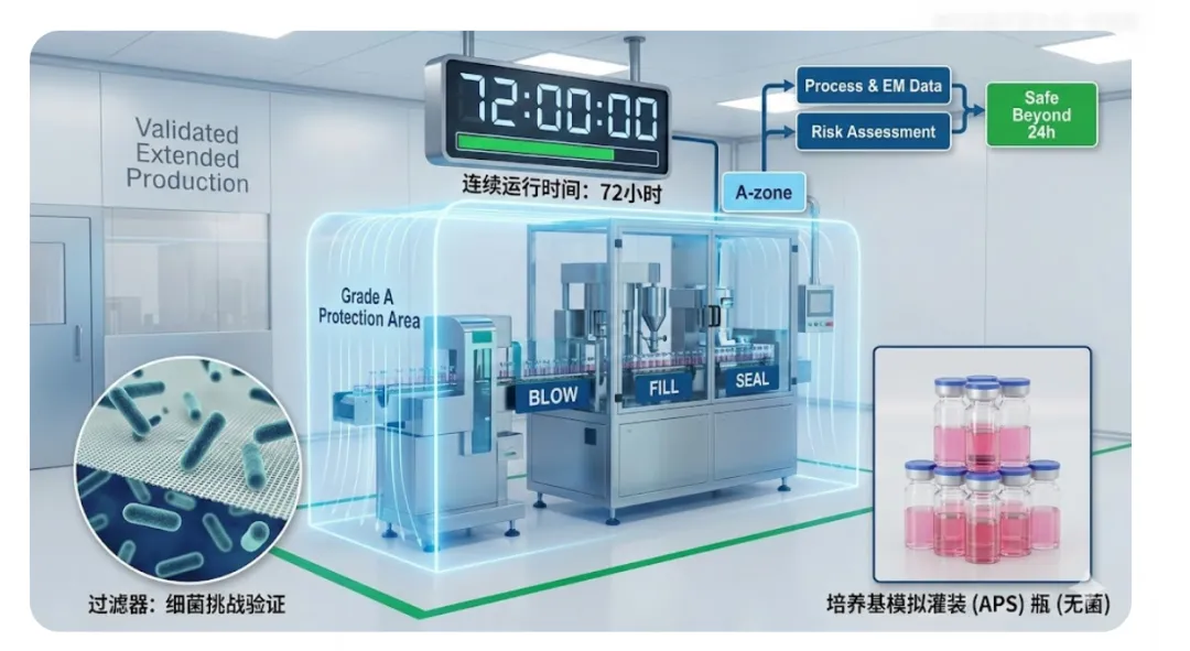 最终,所有的科学逻辑都必须通过培养基模拟灌装(APS)这一“终考”。如果你计划将生产时限设定为72小时,那么你的APS方案就必须具备足够的代表性。这不仅要求在运行初期进行灌装,更要求在最长运行时间的末端进行挑战,以验证设备在经历了数十小时的机械磨损、积碳积累以及滤膜负荷增加后,是否依然能产出合格的无菌产品。这种基于最差条件的验证思路,才是支撑起生产时限跨越24小时的真正脊梁。