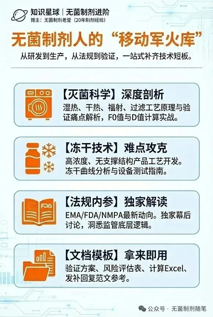 确实,公众号适合碎片化阅读,但很难沉淀成体系的知识库。为了方便大家下载资料和深入交流,我搭建了一个知识星球“无菌制剂进阶”。