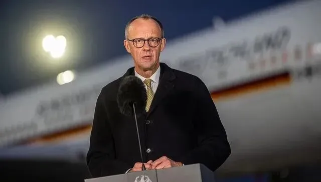 当地时间2026年2月24日,德国柏林,德国总理默茨在启程访华前发表讲话。(图片来源:视觉中国)