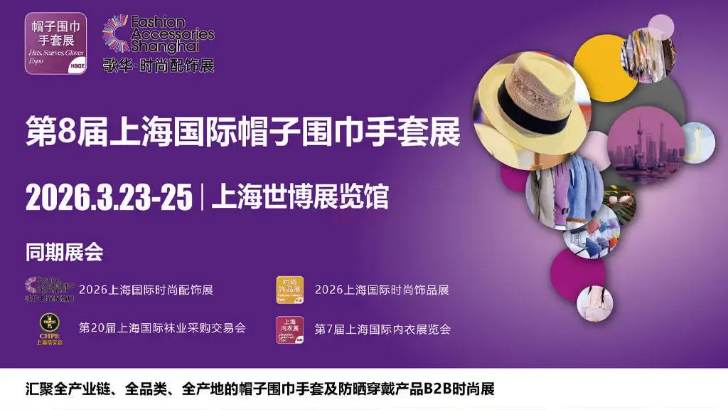 HSGE 2026 第8届上海国际帽子围巾手套展将于2026年3月23日-25日在上海世博展览馆盛大召开。展会自创办之日起,伴随着行业共同成长、发展壮大,展品涵盖了各类:帽子、帽饰、围巾、丝巾、手套、披肩、头巾、耳罩、防晒穿戴产品及相关原辅材料和生产设备等产品,同时新增了面罩、袖套、防晒眼镜、防晒服等防晒穿戴配饰,旨在打造出帽子围巾手套及防晒穿戴产品的全产业链、全品类、全产地的B2B时尚商贸盛会。