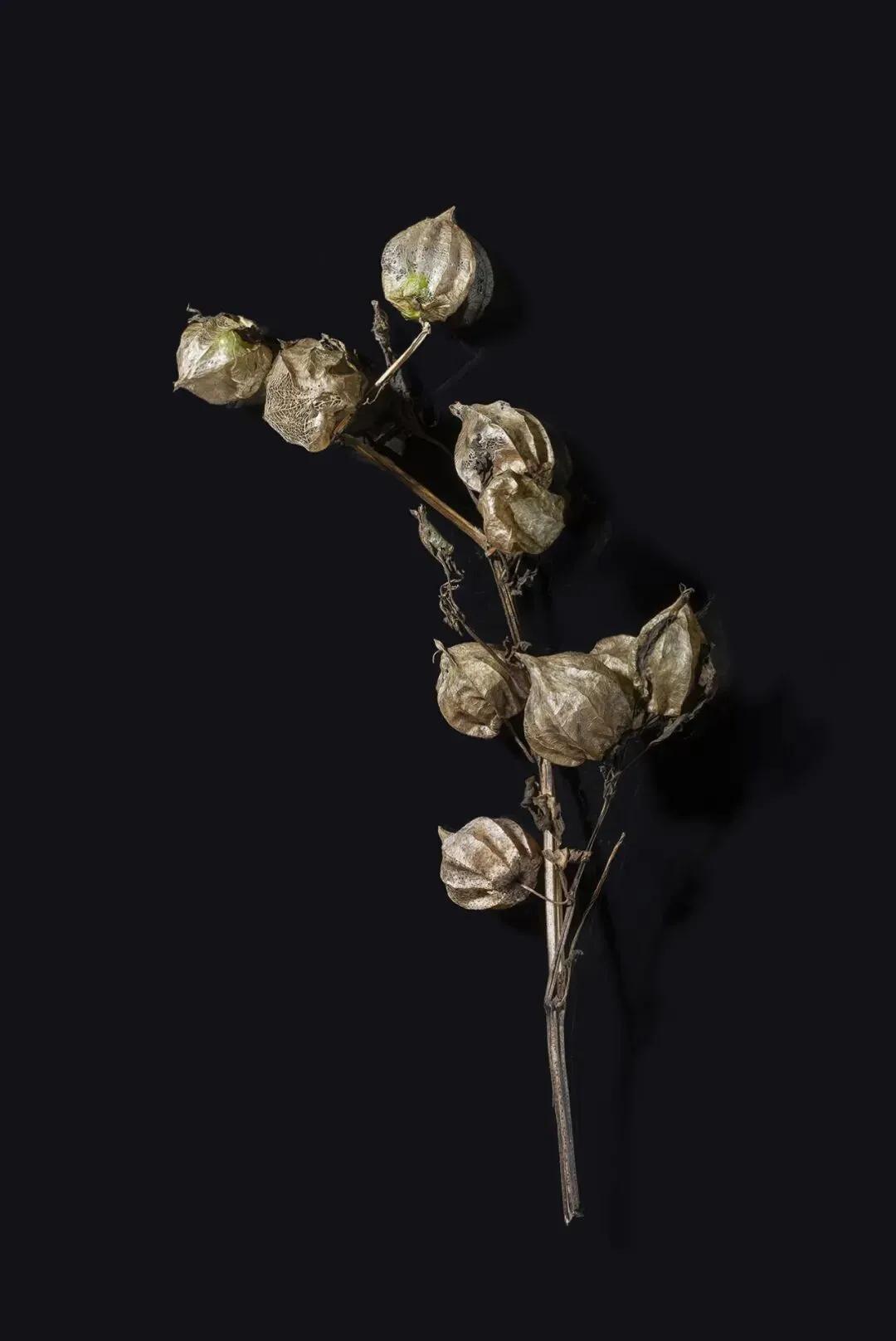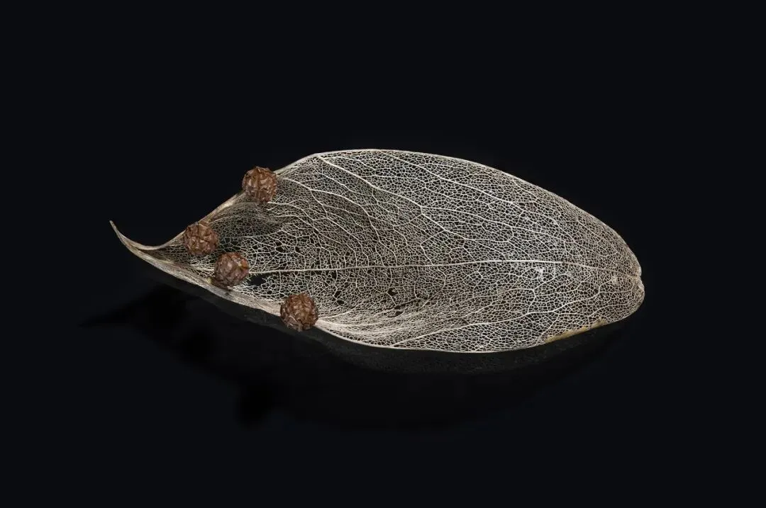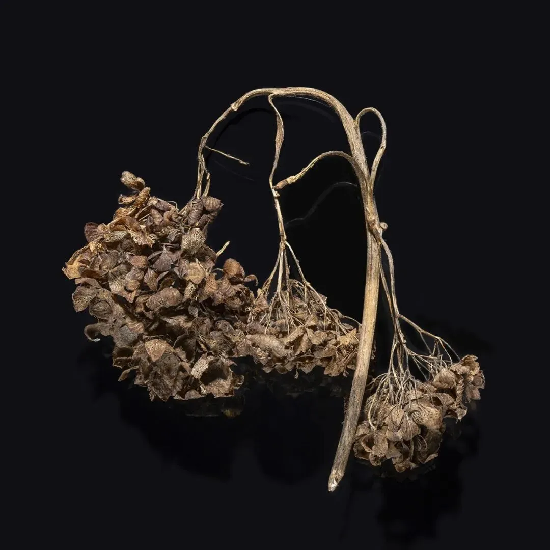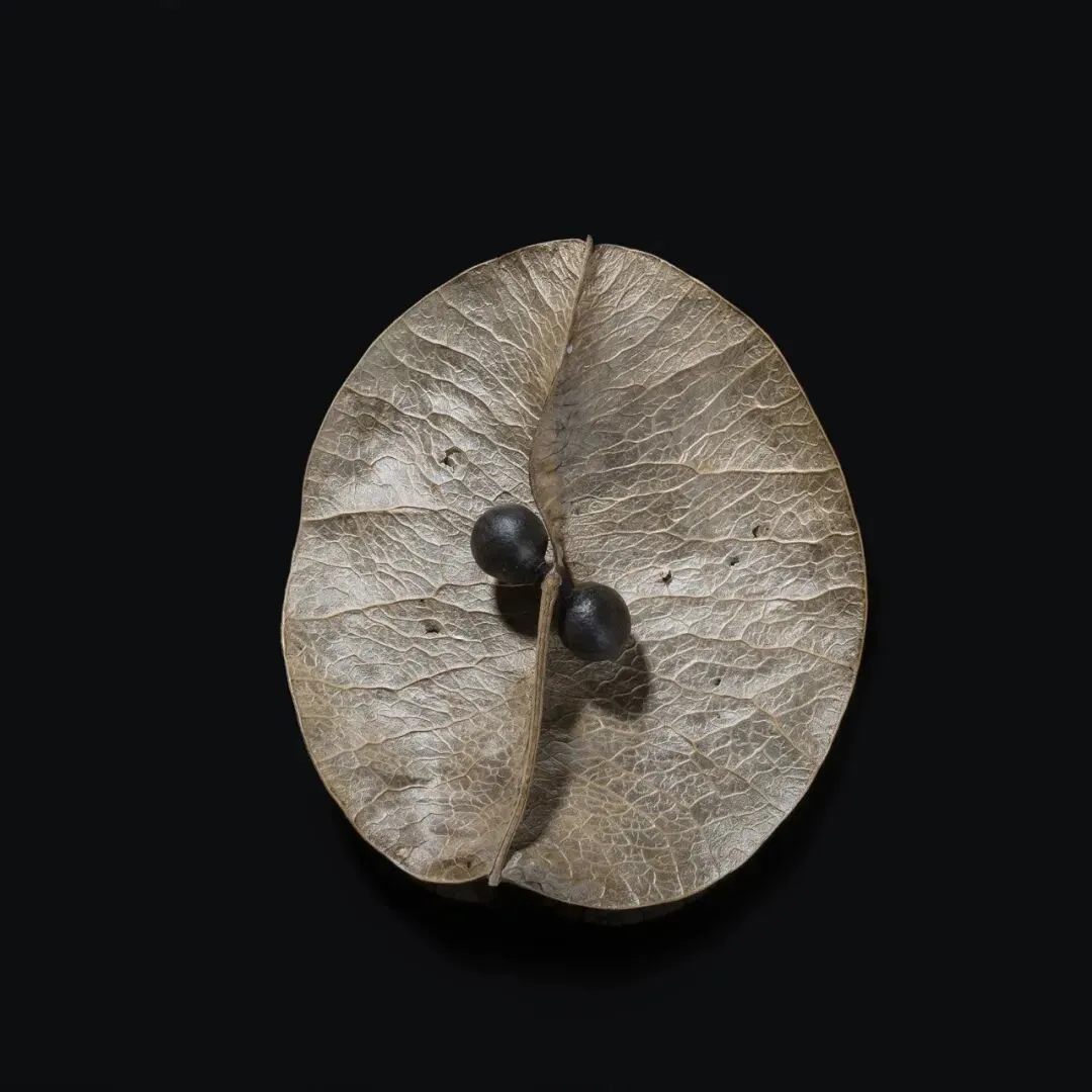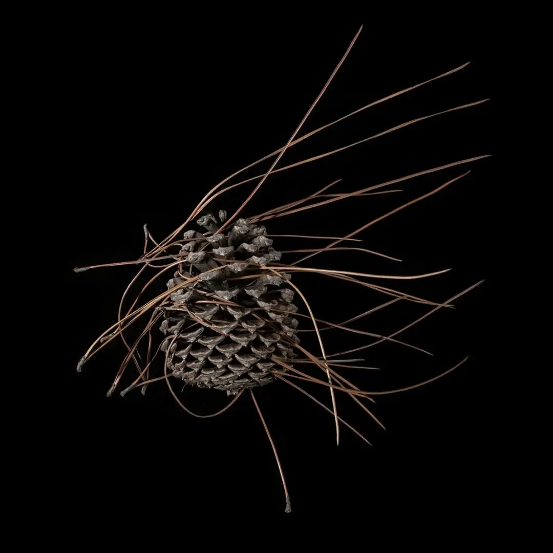 这组作品以“枯萎”为核心命题,通过极端简化的视觉语言,将松果、石榴、枯枝等进入生命末期的植物形态,转化为凝固的生命标本。在纯黑背景的包裹下,柔和的侧光精准捕捉了表皮的斑驳锈色、鳞茎的层叠纹理与枝条蜷曲的弧度,让每一道裂纹、每一处褶皱都成为时间的刻度。作品摒弃了花卉摄影对“盛放”的惯性追逐,以客观、冷静的镜头,凝视生命沉淀与消逝的本真状态。这些静态的植物标本,既是自然演化的物证,也是生命轮回的隐喻。它们在极简的画面中,呈现出一种肃穆的仪式感,邀请观众在微观的肌理里,触摸时间的重量,感受枯萎之中的永恒。