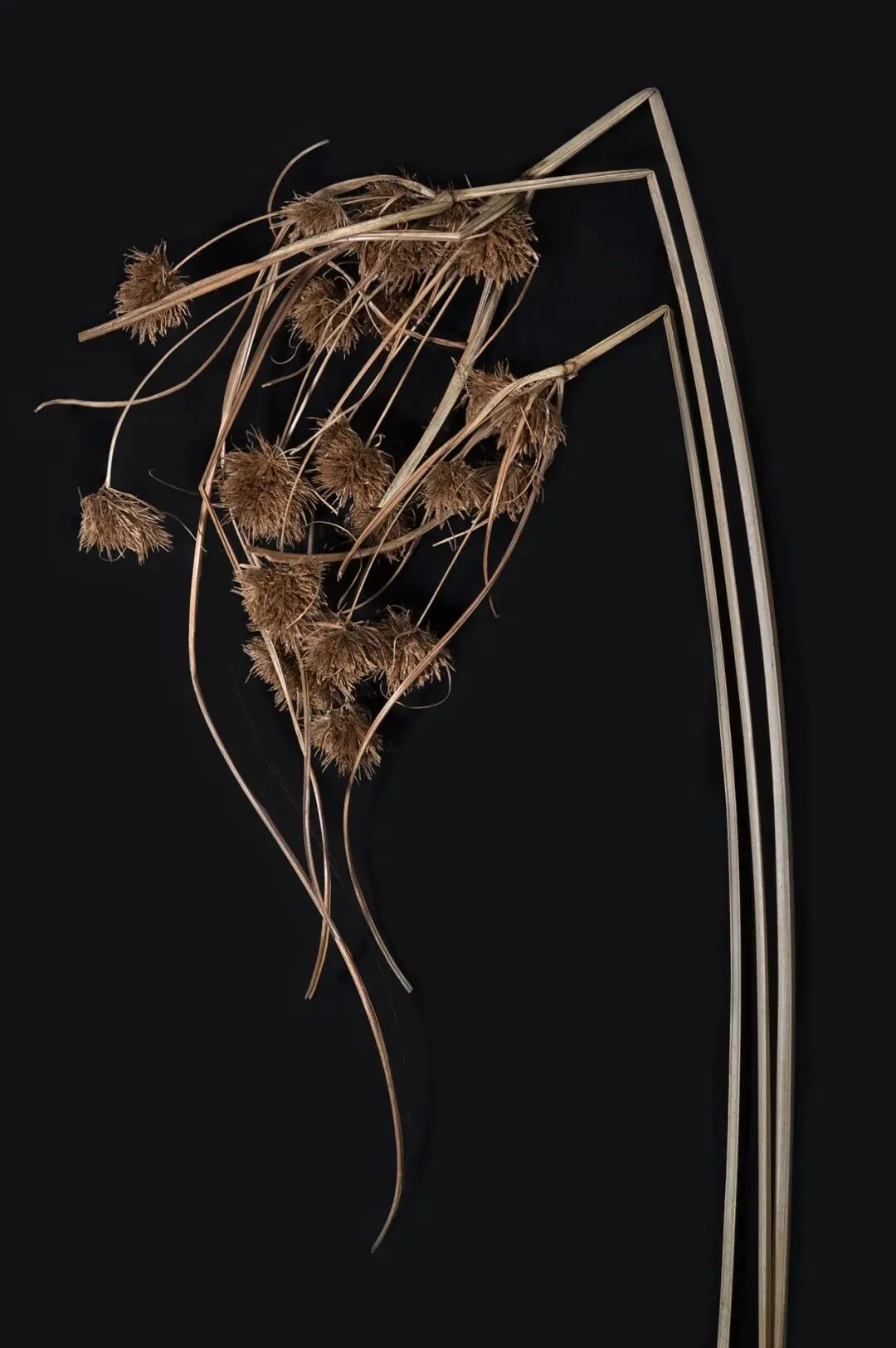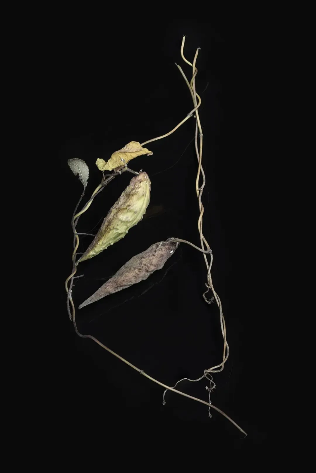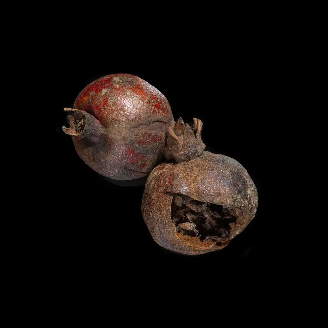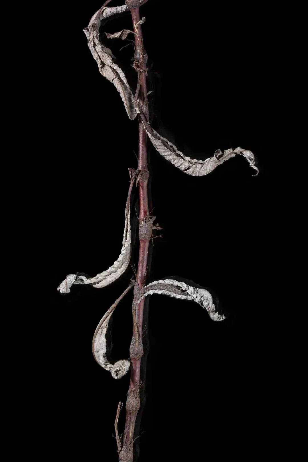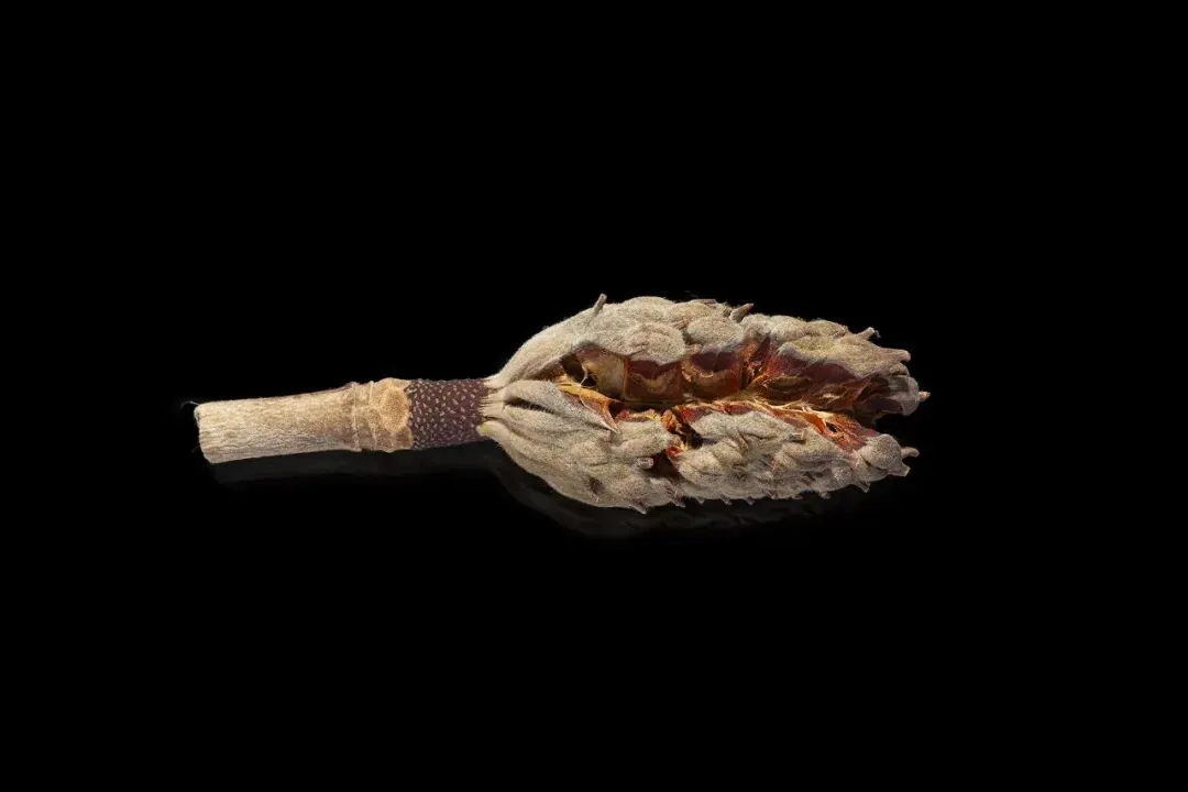 这组作品以“枯萎”为核心命题,通过极端简化的视觉语言,将松果、石榴、枯枝等进入生命末期的植物形态,转化为凝固的生命标本。在纯黑背景的包裹下,柔和的侧光精准捕捉了表皮的斑驳锈色、鳞茎的层叠纹理与枝条蜷曲的弧度,让每一道裂纹、每一处褶皱都成为时间的刻度。作品摒弃了花卉摄影对“盛放”的惯性追逐,以客观、冷静的镜头,凝视生命沉淀与消逝的本真状态。这些静态的植物标本,既是自然演化的物证,也是生命轮回的隐喻。它们在极简的画面中,呈现出一种肃穆的仪式感,邀请观众在微观的肌理里,触摸时间的重量,感受枯萎之中的永恒。