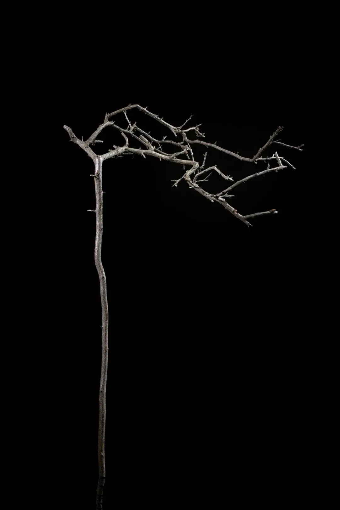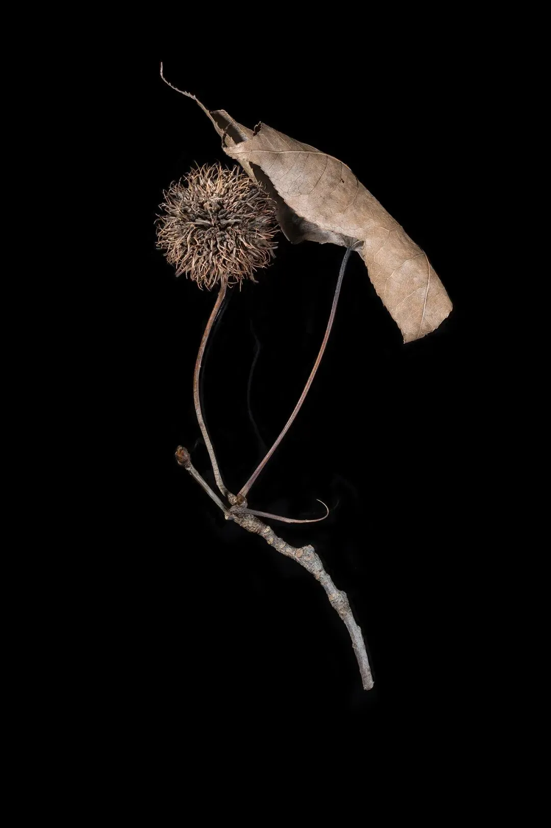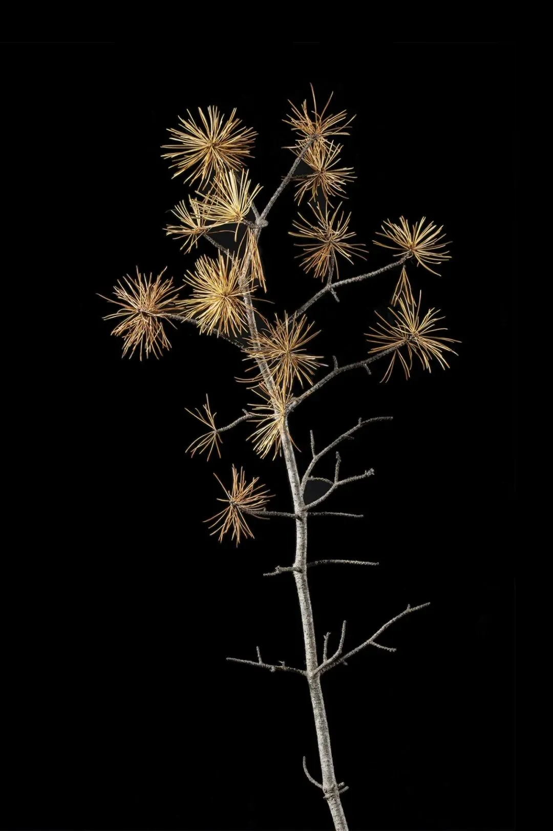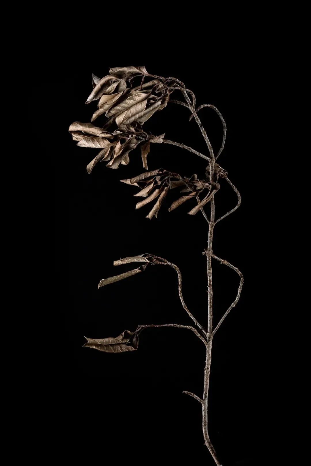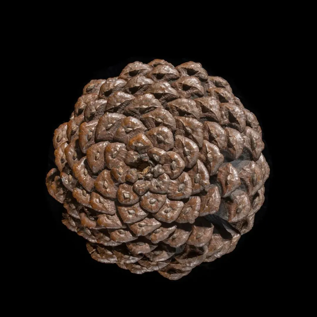这组作品以“枯萎”为核心命题,通过极端简化的视觉语言,将松果、石榴、枯枝等进入生命末期的植物形态,转化为凝固的生命标本。在纯黑背景的包裹下,柔和的侧光精准捕捉了表皮的斑驳锈色、鳞茎的层叠纹理与枝条蜷曲的弧度,让每一道裂纹、每一处褶皱都成为时间的刻度。作品摒弃了花卉摄影对“盛放”的惯性追逐,以客观、冷静的镜头,凝视生命沉淀与消逝的本真状态。这些静态的植物标本,既是自然演化的物证,也是生命轮回的隐喻。它们在极简的画面中,呈现出一种肃穆的仪式感,邀请观众在微观的肌理里,触摸时间的重量,感受枯萎之中的永恒。