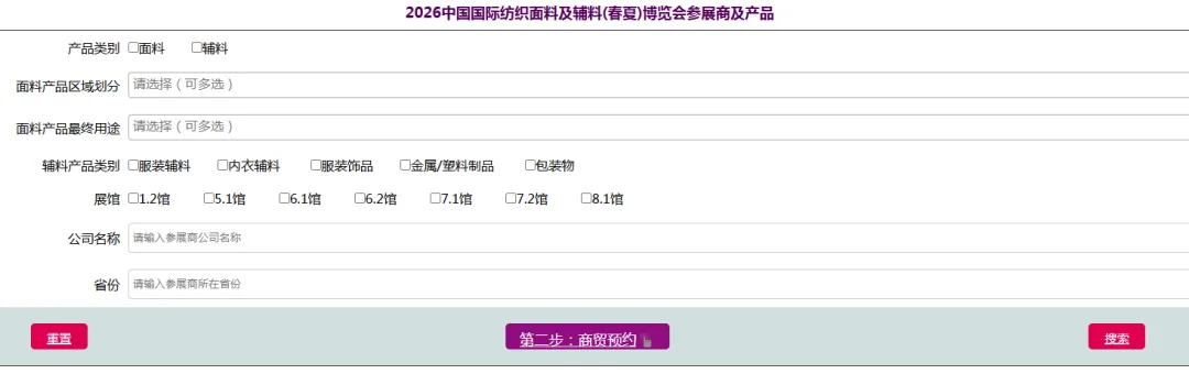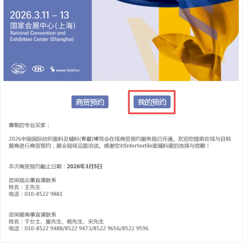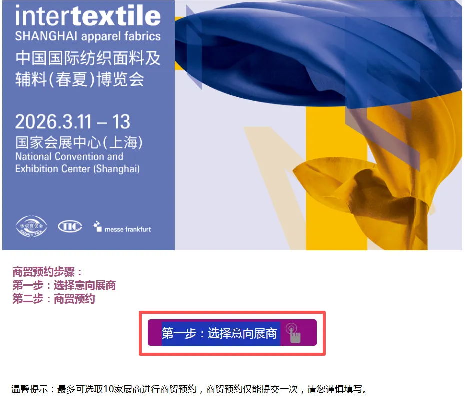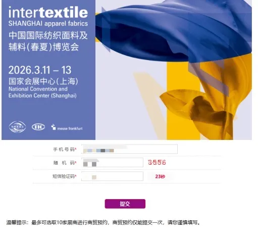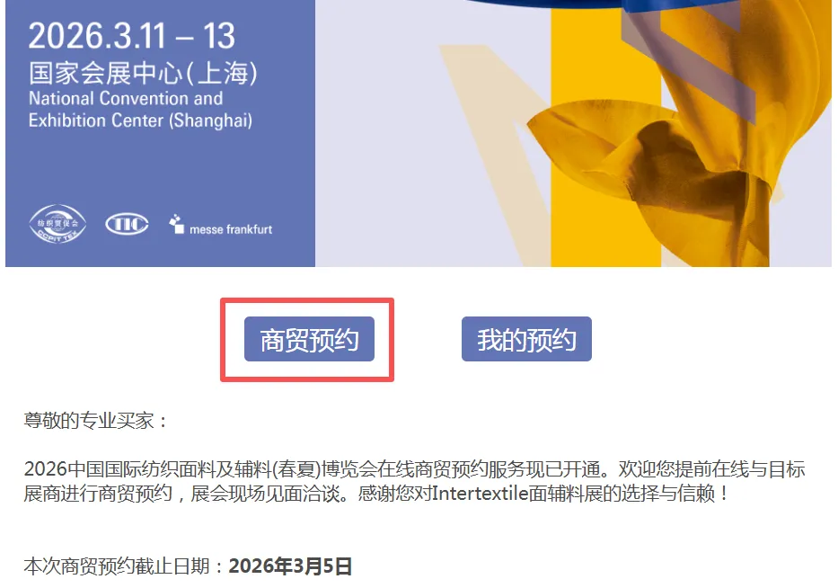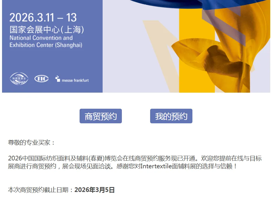 2026中国国际纺织面料及辅料(春夏)博览会(简称:2026 Intertextile 春夏面辅料展)将于3月11日至13日在国家会展中心(上海)举办。为进一步提升本届展会的商贸实效,优化供需双方对接效率与精准度,展会组委会持续升级服务体系,现正式推出线上“商贸预约”平台。该平台旨在帮助专业买家和参展商提前锁定合作意向、规划行程安排,助力双方实现更高效的现场对接。