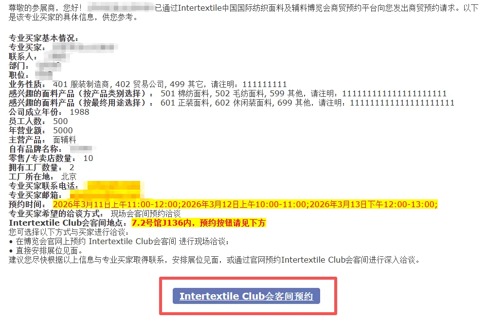 下图为被勾选的展商收到的通知邮件内容,可通过专业买家联系电话和邮箱与邀请人建立初步联系,在充分沟通后由展商或专业买家任意一方点击紫色预约按钮预订会客间。(会客间预约功能已上线)