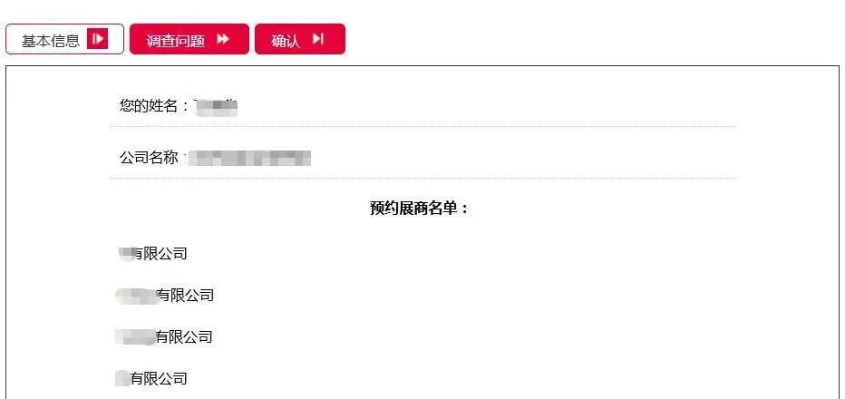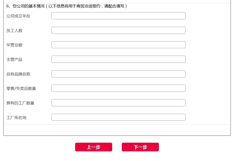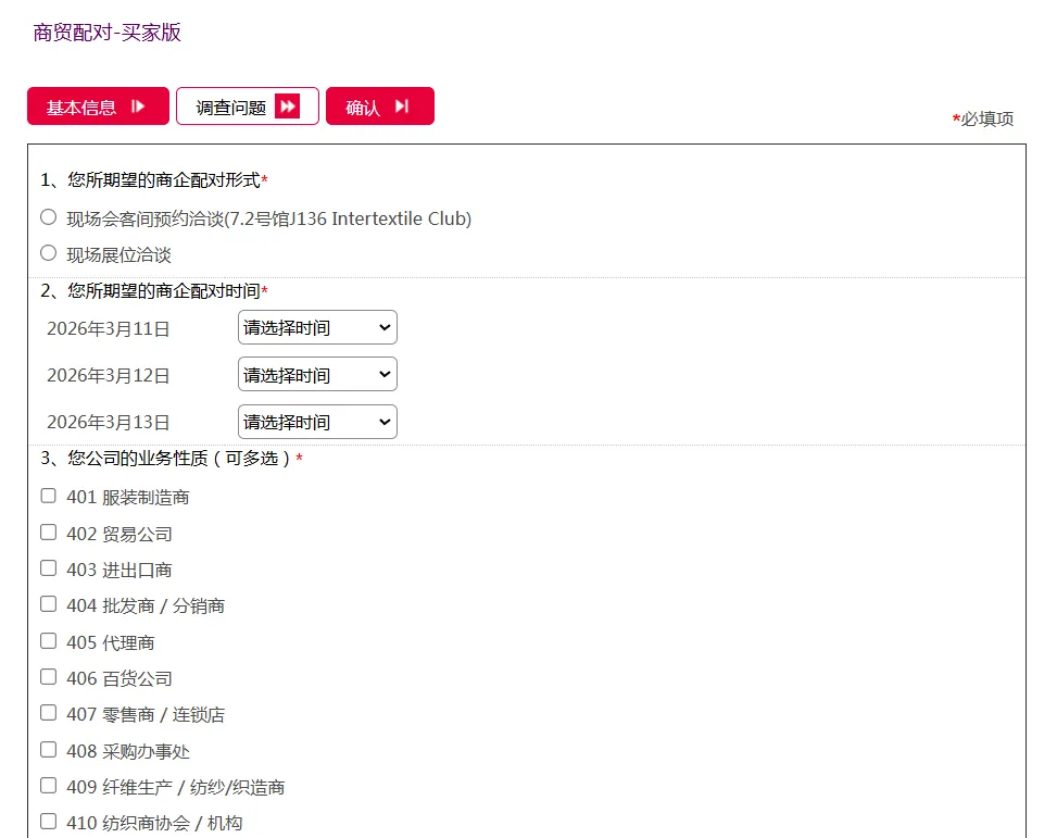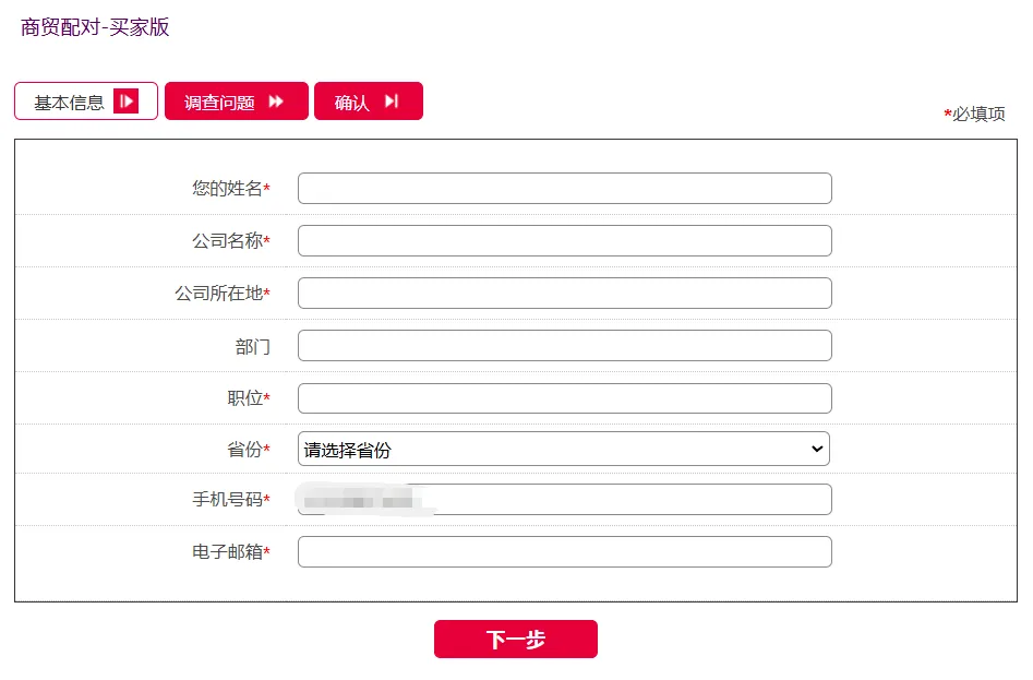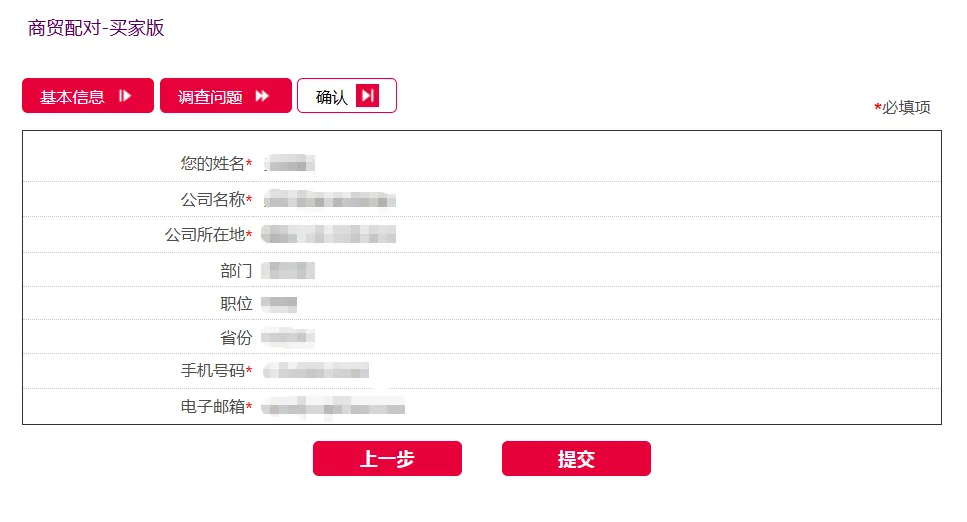 *根据要求填写专业买家基础信息、采购意向(调查问题)(如已完成预登记,会自动带入,可修改),包括企业基本信息、感兴趣产品、期望的商企配对形式及时间等。