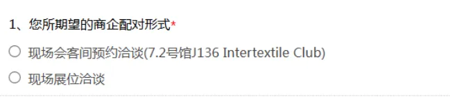 它可以让专业买家与参展商提前联系,并了解彼此。买家可以在预约页面输入采购意向,系统推荐对应展商列表,买家可点击了解每家展商的详细信息,从中选取多至10家展商进行联络;当买家提交预约后,被选中的展商将收到“选中”提示邮件及短信,获知专业买家的信息、预约时间和洽谈地点(可选择现场展位对接, 也可以在线预约Intertextile CLUB会客间);