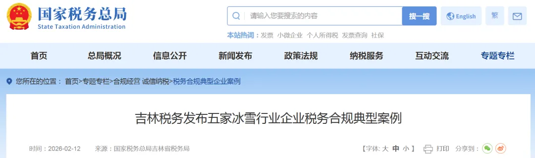 吉林省地处世界黄金冰雪带,冰雪运动与旅游成为拉动吉林省冬季消费与产业升级的重要力量。《关于推动吉林省冰雪经济高质量发展的实施意见》提到,到2027年—2028年雪季,冰雪旅游接待游客达到2.3亿人(次),到2030年,冰雪旅游接待3亿人(次),冰雪装备制造业总产值超过50亿元。随着冰雪旅游人次与产业规模的持续扩大,诚信经营与合规管理成为企业参与市场竞争的重要基石。日前,国家税务总局吉林省税务局发布五家冰雪行业企业税务合规典型案例,通过总结推广其在税务合规管理方面的先进经验,为同行业经营者提供可参考的范本,引导更多经营主体增强依法纳税意识,构建健康、规范的行业生态。