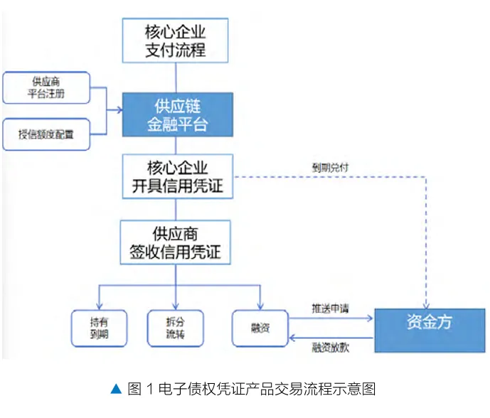 (1) 电子债权凭证。电子债权凭证是指供应链核心企业依据真实贸易关系,通过供应链信息服务系统向供应链链上企业等应收账款债权人出具的,承诺按期支付相应款项的电子化记录,可拆分、流转。电子债权凭证产品是市场上发展最早、最成熟的供应链金融产品,如中企云链的云信已有十年历史。目前这类产品的年交易规模或已突破5万亿元、平台数量超过600家,构成了供应链金融市场的基本盘。而2025年4月出台的关于规范供应链金融业务的77号文,使该类产品走入统一监管、规范管理的发展阶段(如图1所示)。