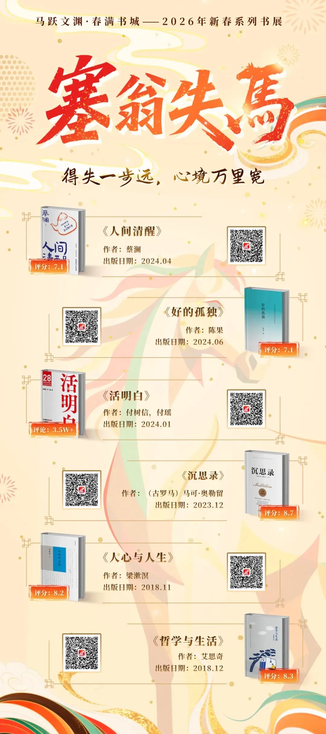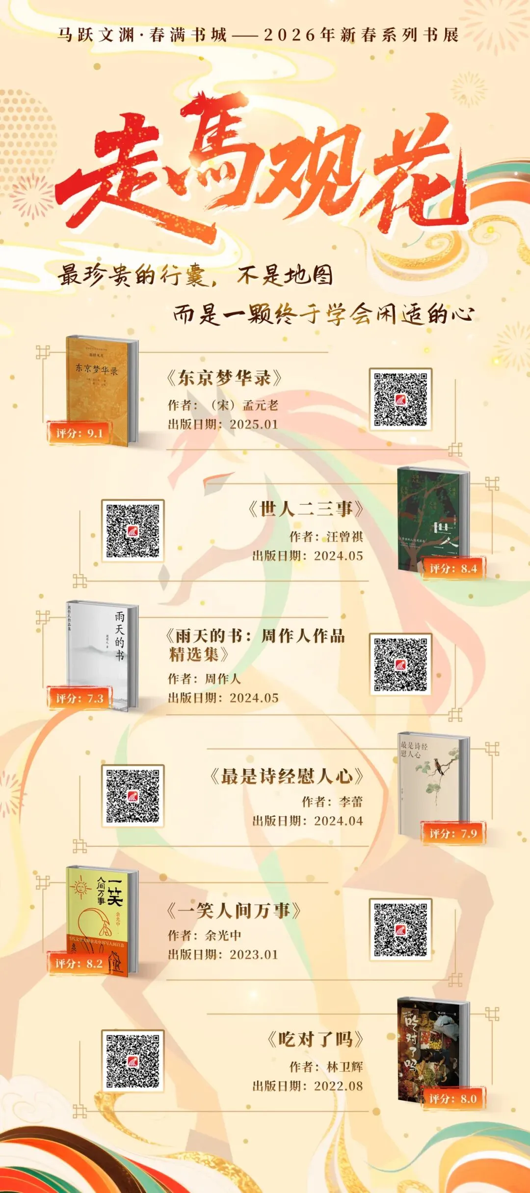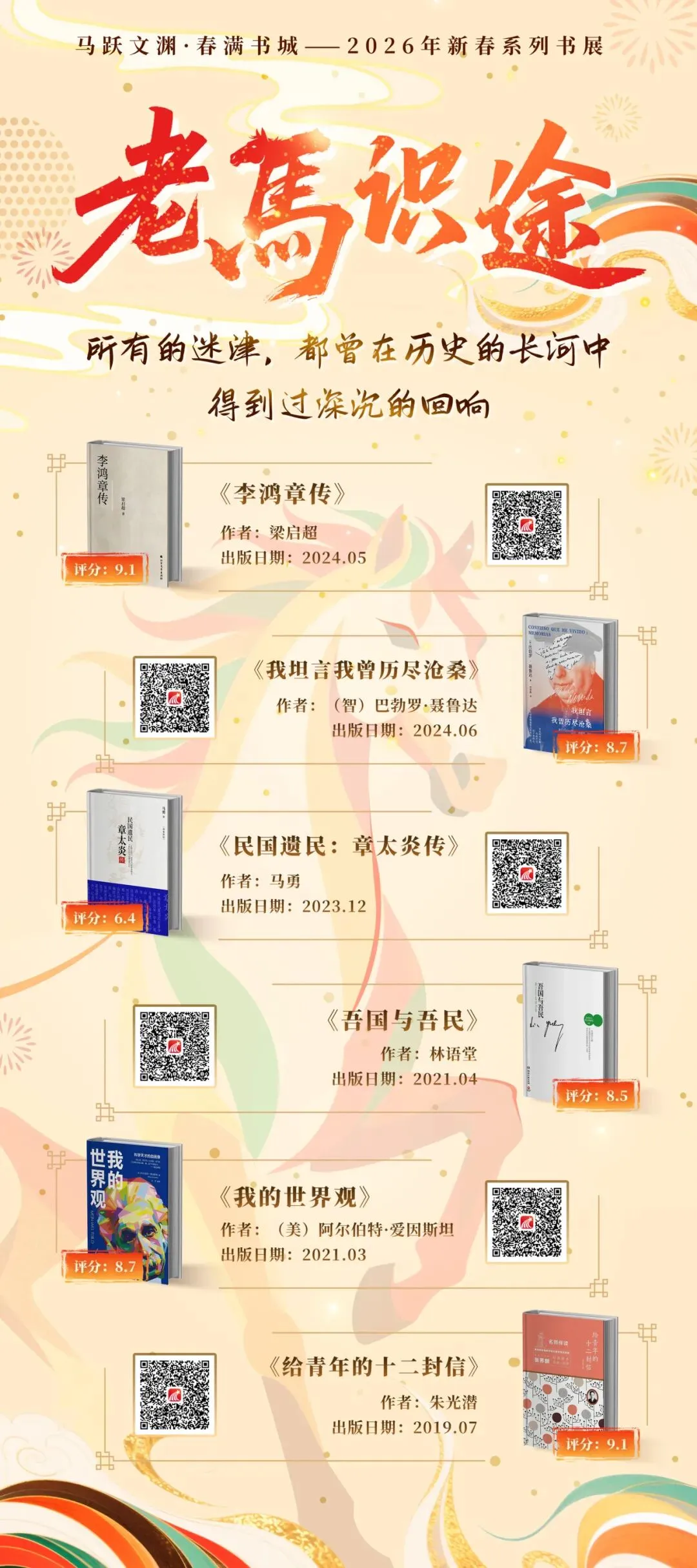 本书展以“马”为引,精选十三个含“马”成语,依其意境配以新书佳作:从梁漱溟、吕思勉、林语堂的沉静著述,到朱天心、陈果、杨天真等人的敏锐书写,涵盖小说、传记、历史、情感等诸多领域。每一组成语与书籍的相遇,都是古今精神的一次共振,它让沉淀千年的语汇焕发生机,引领我们共同感受中华文化绵延不绝的磅礴气韵。