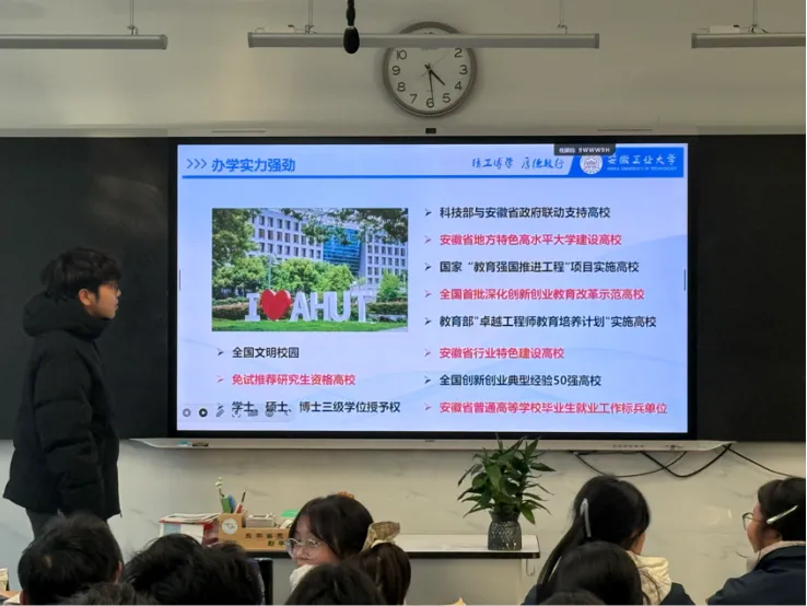 活动中,朱亚男、周安冉等同学以亲身经历为蓝本,向高三学弟学妹介绍安徽工业大学的办学底蕴、校园环境与人才培养成果,重点讲解自动化等优势专业的学科实力、实训平台、竞赛成果与就业前景。同学们通过PPT展示、互动问答、经验交流等形式,分享大学学习生活、备考心得与志愿填报技巧,耐心解答大家关心的专业选择、未来发展等问题。