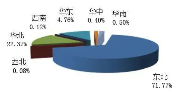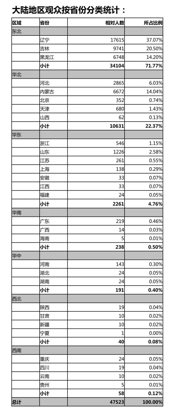 按照行政区域分析,观众来自非展会举办地的各区域比例如下图所示,可以看到,来自东北地区的观众占了相对比例71.77%,其他区域分别为:华北22.37%,华东4.76%,华南0.5%,华中0.4%,西北0.08%,西南0.12%。