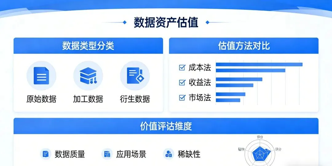 操作要点:筛选3-5个同类数据资产交易案例,对比数据质量、用途、体量,计算调整系数(0.8-1.2),估值=同类案例交易价×调整系数。
