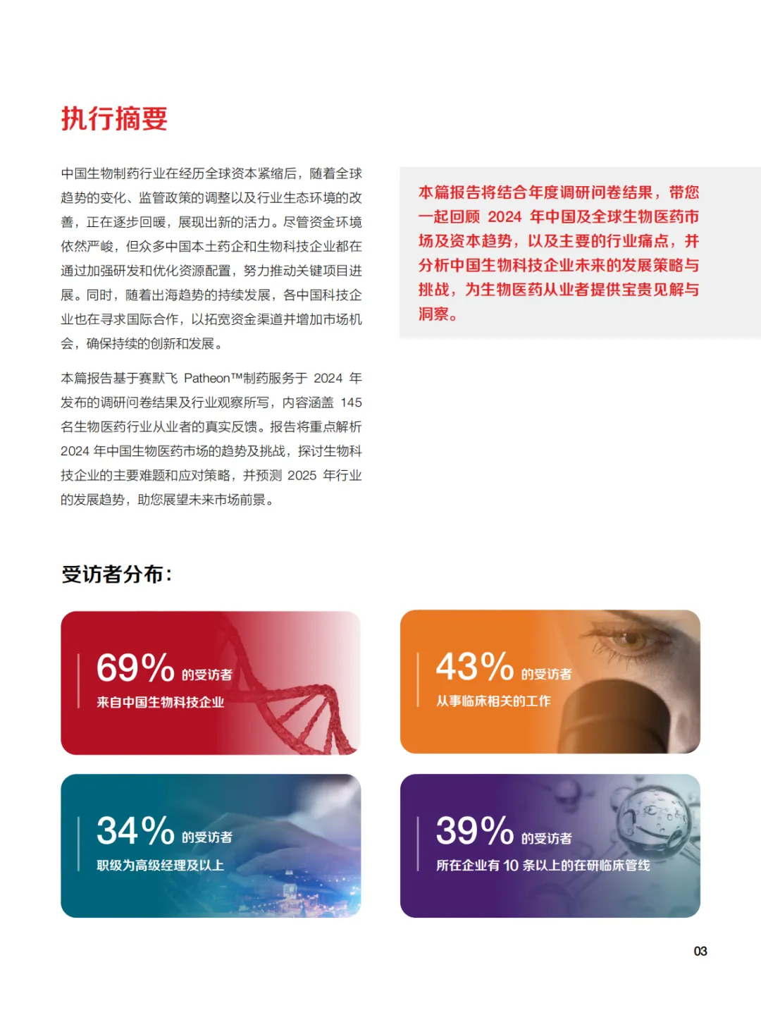 本篇报告基于赛默飞 Patheon™制药服务于 2024 年发布的调研问卷结果及行业观察所写,内容涵盖 145名生物医药行业从业者的真实反馈。报告将重点解析2024 年中国生物医药市场的趋势及挑战,探讨生物科技企业的主要难题和应对策略,并预测 2025 年行业的发展趋势,助您展望未来市场前景。