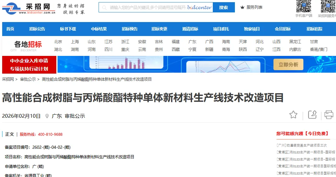 近日,从采招网获悉,广东嘉元新材料有限公司“高性能合成树脂与丙烯酸酯特种单体新材料生产线技术改造项目”进行备案公示。