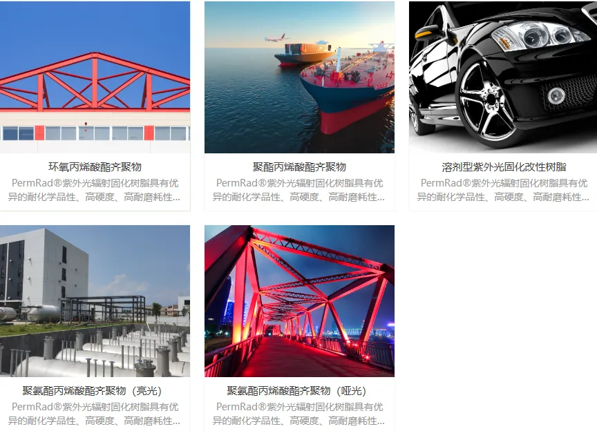 UV树脂主要牌号为PermRad®,主要包括环氧丙烯酸酯齐聚物、聚酯丙烯酸酯齐聚物、溶剂型紫外光固化改性树脂、聚氨酯丙烯酸酯齐聚物(高亮)、聚氨酯丙烯酸酯齐聚物(哑光)等多个细分产品,主要特种如下: