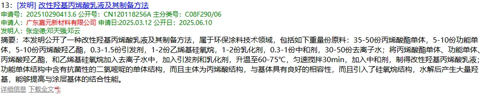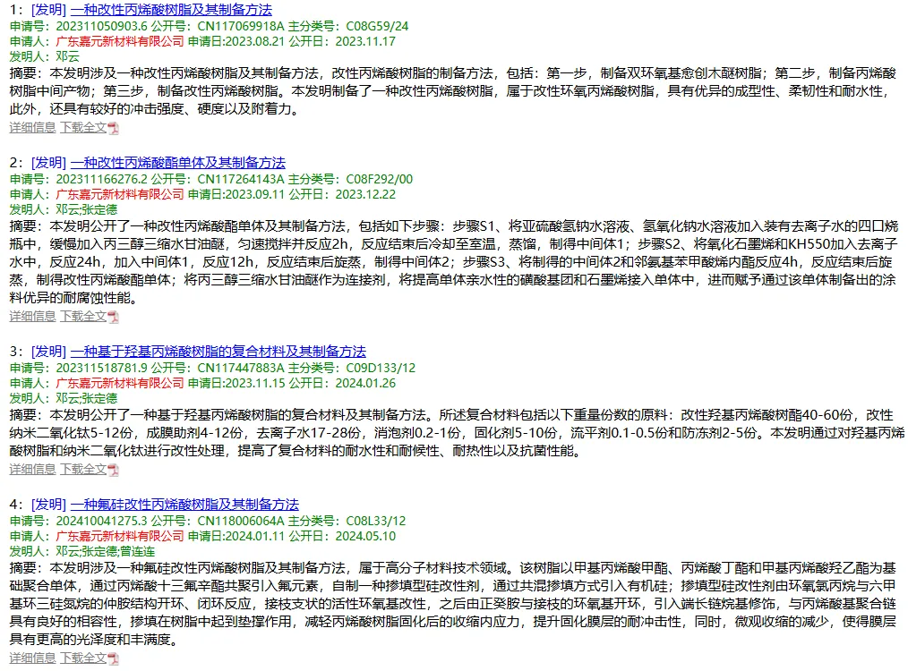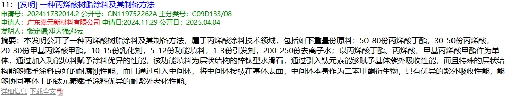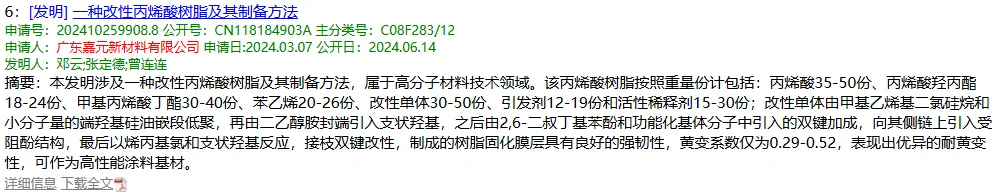 公开资料查得,公司发布了7项发明专利,主要集中在丙烯酸树脂及相关单体的合成方面。