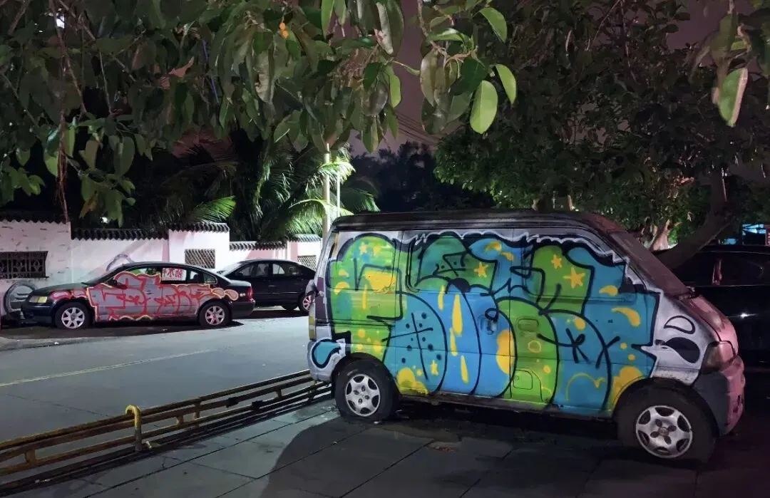 最特别的一次,是在一栋七八层高的烂尾楼里。我爬到五层,在一面能俯瞰整个海口的野墙上创作,感觉非常棒。我画得很投入,结束时才发现身后安静地站着两位流浪汉。他们可能在我画到一半时就来了,没有打扰,也没有排斥,只是静静地看着。我画完,他们也没多话,就离开了。那种感觉,仿佛我们都被默认为这个城市空间的一部分。