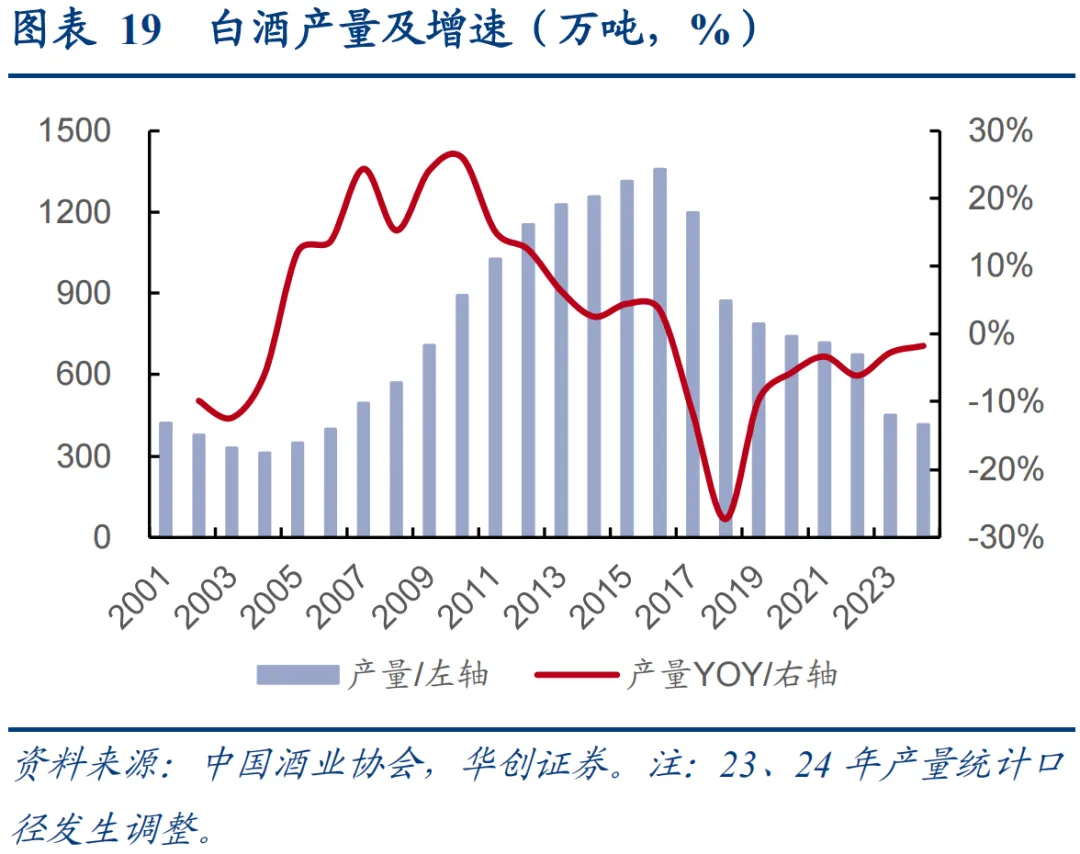 国内白酒行业产量2016年达到1358万吨见顶,随后受“少喝酒、喝好酒”的健康饮酒理念和人口老龄化影响,白酒企业产量持续下降,2023年白酒统计口径发生调整,进一步剔除配制酒,2024年规模以上企业总产量仅为414.5万吨,同比下降1.8%