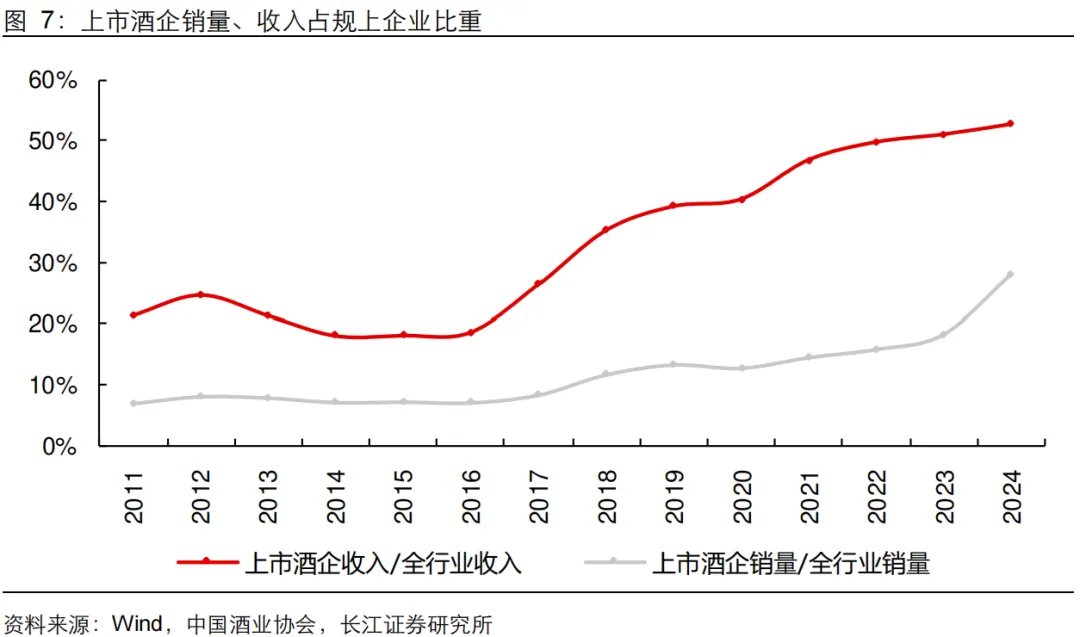 2024年上市酒企(不含顺鑫农业)实现销量115.25吨,占规模以上酒企产量的28%,这一占比再创历史新高,市场份额持续向头部集中,充分体现“喝好酒”的消费趋势