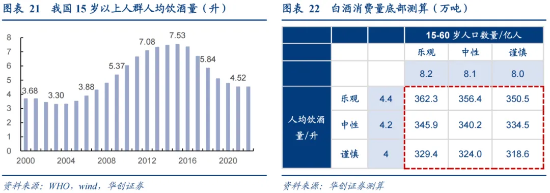 受到健康饮酒理念和人口老龄化影响,华创证券预计预计未来5-10年白酒消费量会回落至300-350万吨,2024年我国人口总数约14亿人,其中15-60岁的饮酒主要年龄段人群占比约62%。预计未来5-10年我国人口总量下降至13.5亿左右,乐观/中性/谨慎预计15-60岁人口占比下降至61%/60%/59%,根据WHO数据,2022年我国人均酒精消费量为4.5升,2016年以来我国人均酒精消费量逐步下降,预计未来5-10年趋势延续下降,乐观预计未来人均饮酒量略降至4.4升,谨慎预计降至4升