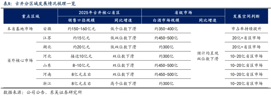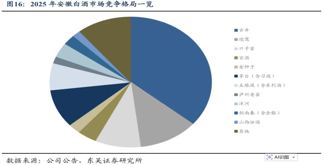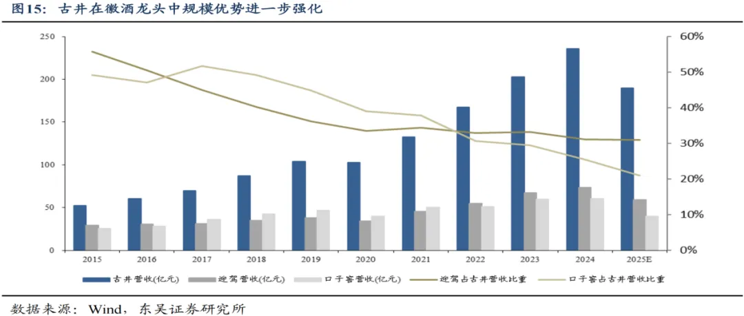 古井作为老八大名酒和中部大省安徽白酒龙头,在泛区域性名酒中综合竞争力相对领先,古井2024年收入达到235.78亿元,2016-2024年收入CAGR达到19%,东吴证券预计预计口子窖占古井营收的比重从2015年的49%持续下滑至2025年的21%左右,而迎驾占古井营收的比重从2015年的56%快速下滑至2020 年的34%、2021-2025年基本保持相对稳定