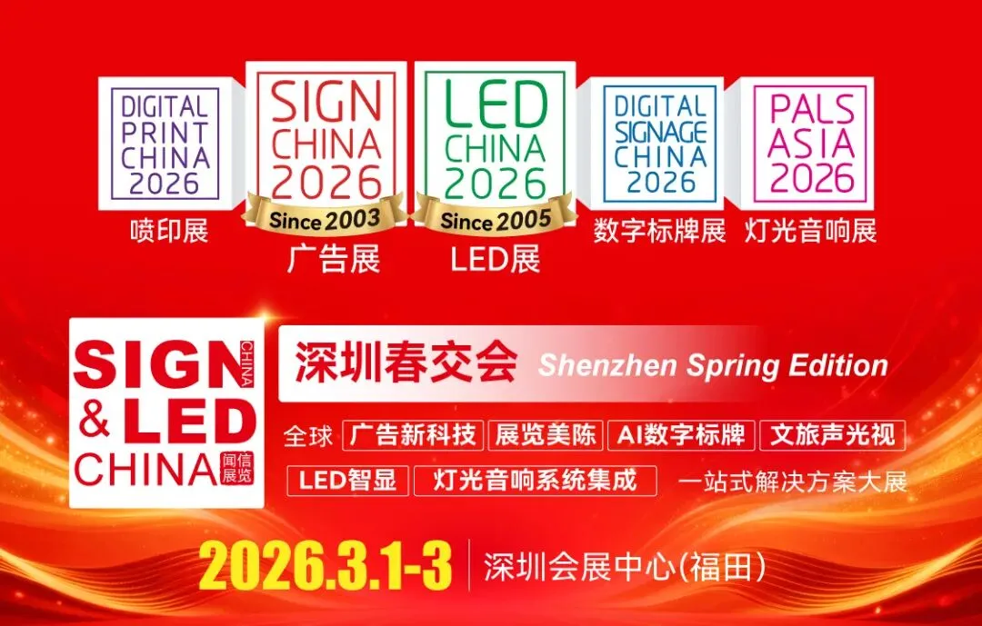 SIGN CHINA & LED CHINA 2026深圳春交会,3月1-3日深圳会展中心(福田)盛大举办!全球广告新科技、展览美陈、AI数字标牌、文旅声光视、LED智显、灯光音响系统集成 一站式解决方案大展!
