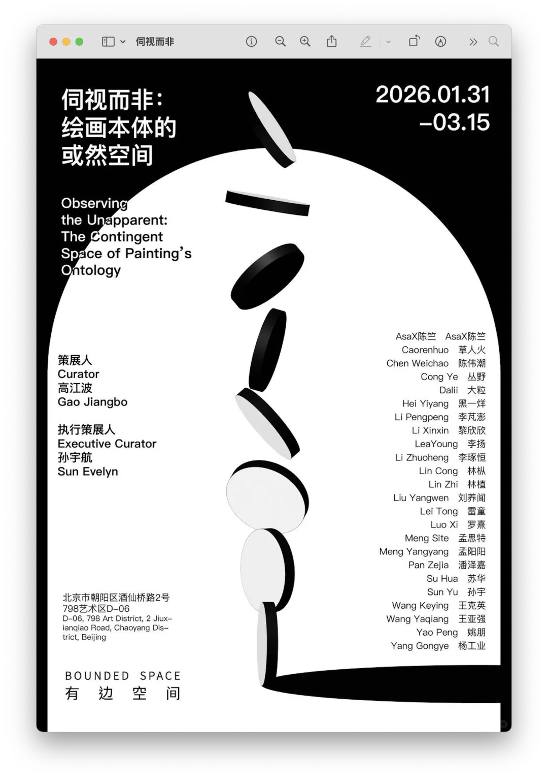 展览主题以“观测者效应”(Observer Effect)这一现象与概念为引入,聚焦物理学中“观测”意象的本初语境,以“意识如何作用于物质”(观察者效应下的“波粒二象性”)为核心隐喻,同时将其在心理学、社会学乃至当代艺术领域的拓展,一并纳入绘画本体的可能性讨论。展览通过呈现24位艺术家的架上作品,探寻“绘画本体”在脱离叙事与表意后的诸种创造性可能。