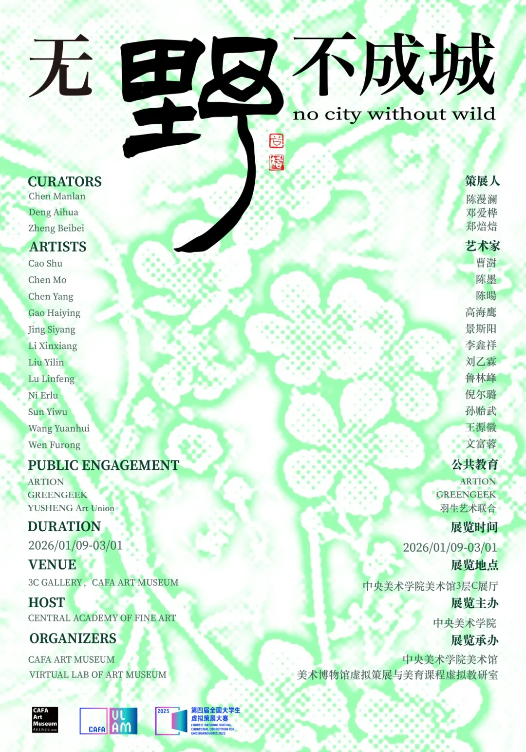 “无‘野’不成城”,受谚语“无木不成林,无水不成渊”的启发,其揭示了整体与部分、依存与生成的关系。 本次展出作品从不同的角度出发,“野”在其中被反复书写:被人类记忆重构、被技术与物质文明推向未知边界的动态疆域。行经其间,既步入物质与精神的交错之地,也步入对未来伦理的试探场——本展览诚邀观众一同追寻“野”的行迹。