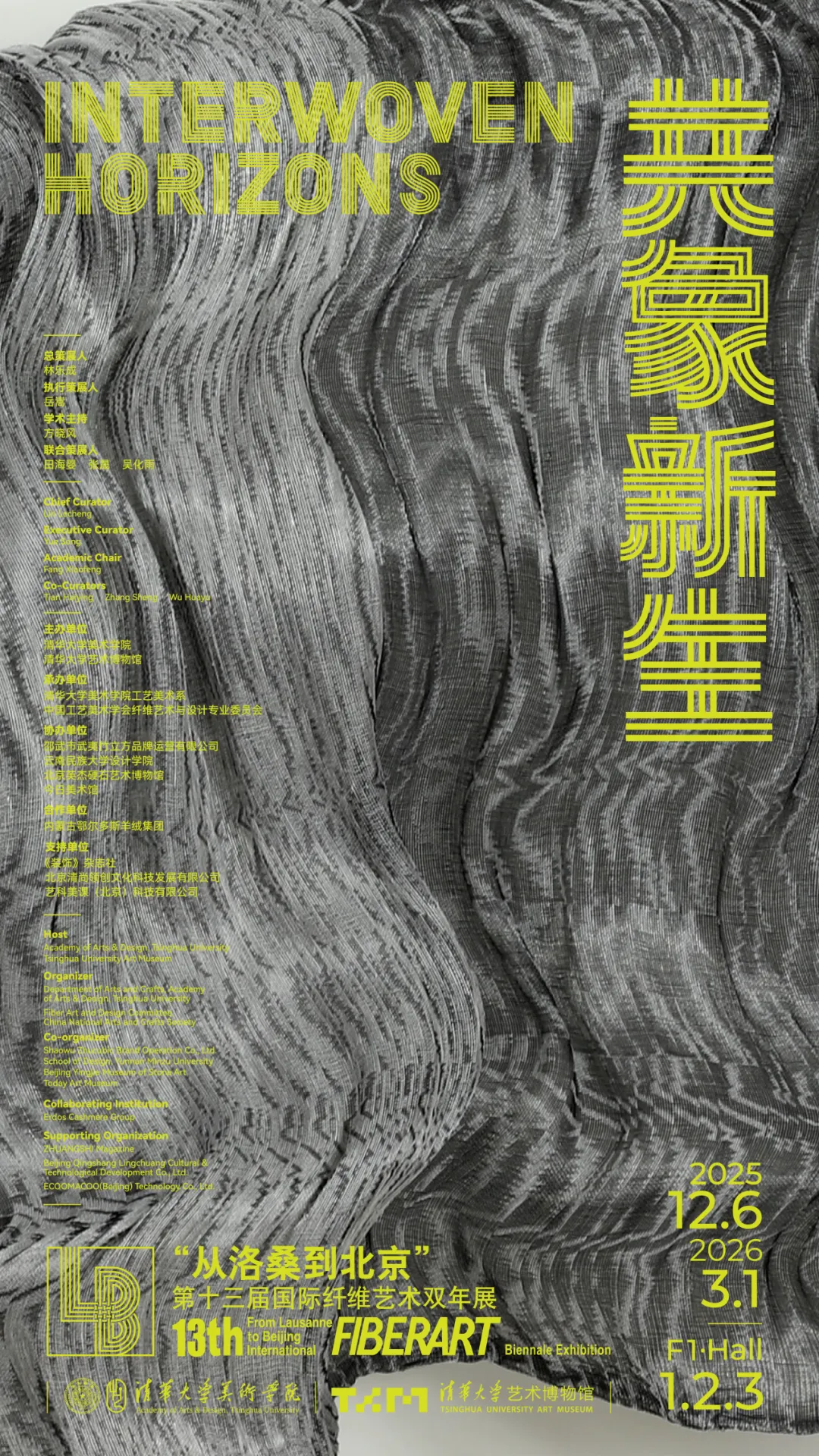 本届展览“从洛桑到北京”第十三届国际纤维艺术双年展将以“共象新生”为主题,聚焦纤维艺术在材料文化、生态伦理与科技演化中的交汇路径,关注纤维媒介在当代表达中如何承载触觉经验与文化传承,如何连接本土与全球、传统与未来。本届展览共分为3个展馆、5个展区,对应5个子主题。