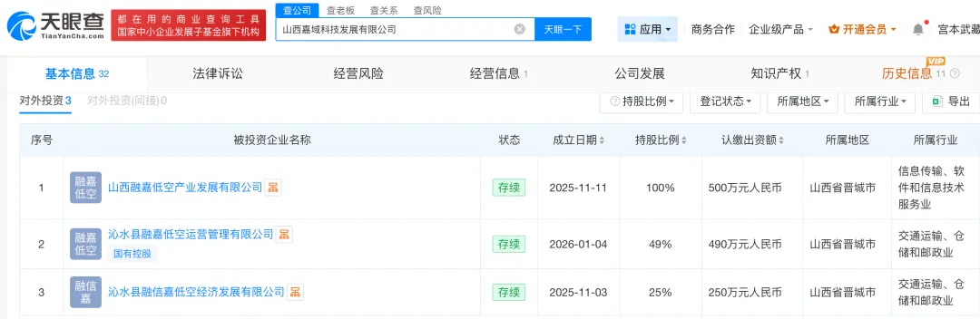 2025年中,嘉域科技经营范围新增智能无人飞行器制造、智能无人飞行器销售等相关业务;同年底至今年初,先后投资成立三家子公司,其经营范围均与智能飞行服务有关。其中,沁水县融嘉低空运营管理有限公司还有当地国资参与,由沁水经开区管理委员会持股51%,嘉域科技持股49%。