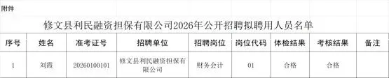 根据《修文县利民融资担保有限公司2026年公开招聘工作人员公告》有关规定,经报名、资格初审、笔试、资格复审、面试、体检、考察等环节,确定了拟聘用人员,现予以公示,公示期5个工作日(2026年2月28日-3月5日)。