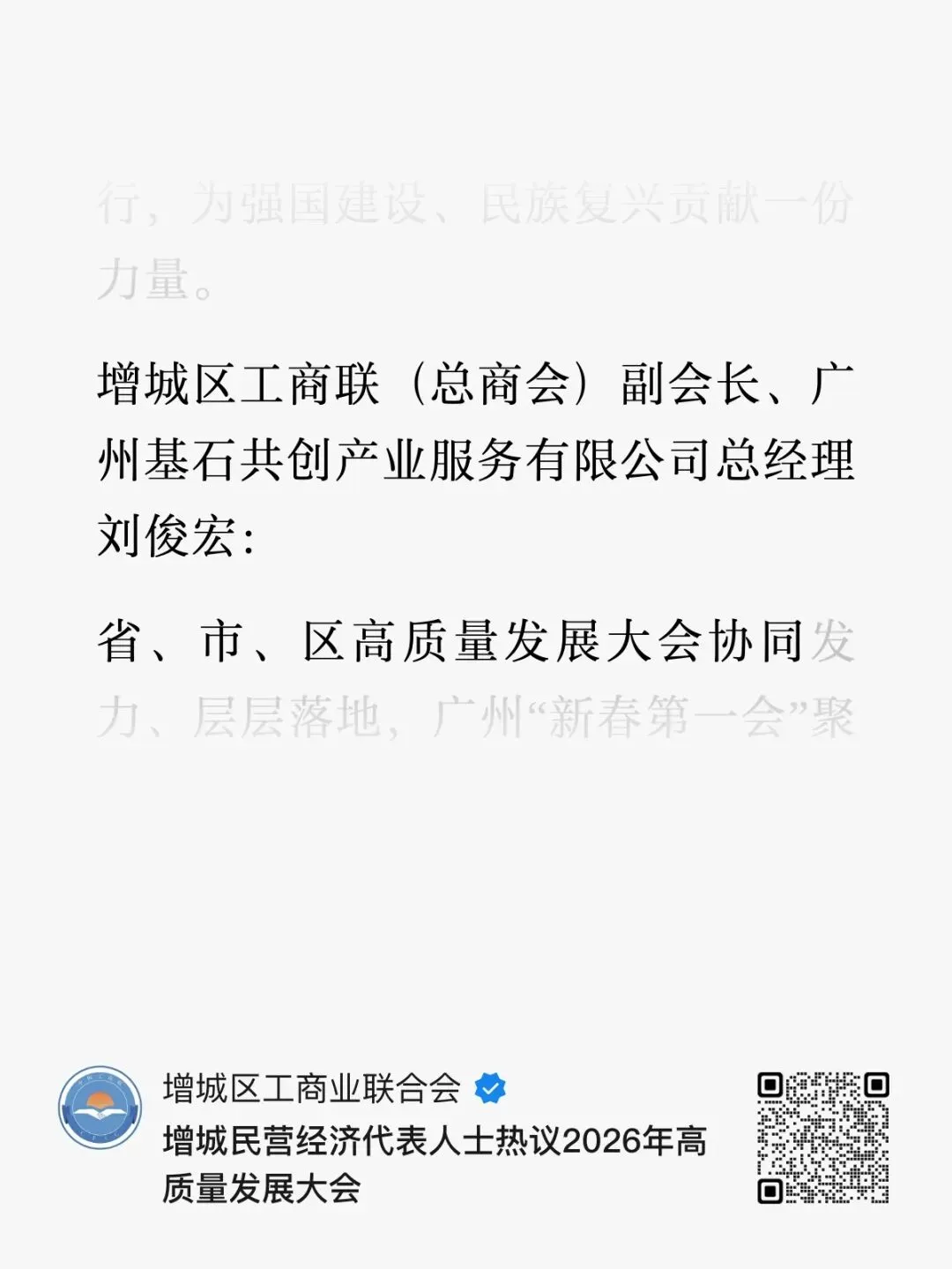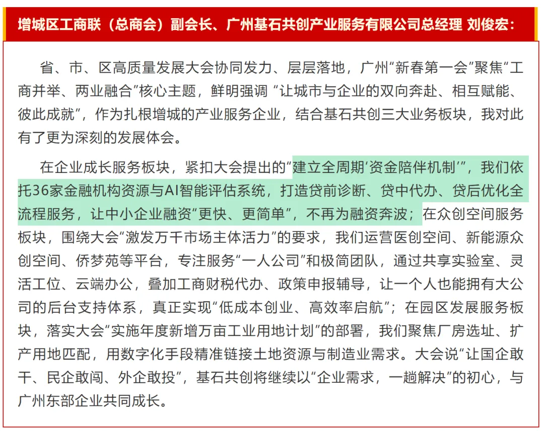 作为扎根增城的产业服务企业,增城区工商联(总商会)副会长、广州基石共创产业服务有限公司总经理刘俊宏表示,大会提出的“建立全周期‘资金陪伴机制’”,正是基石共创企业成长服务板块的核心方向。