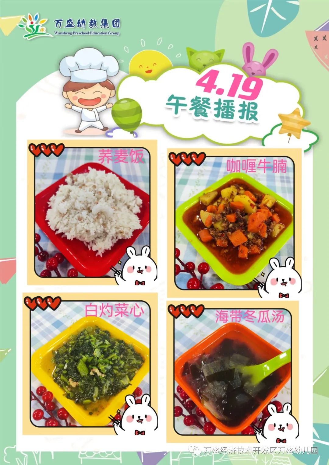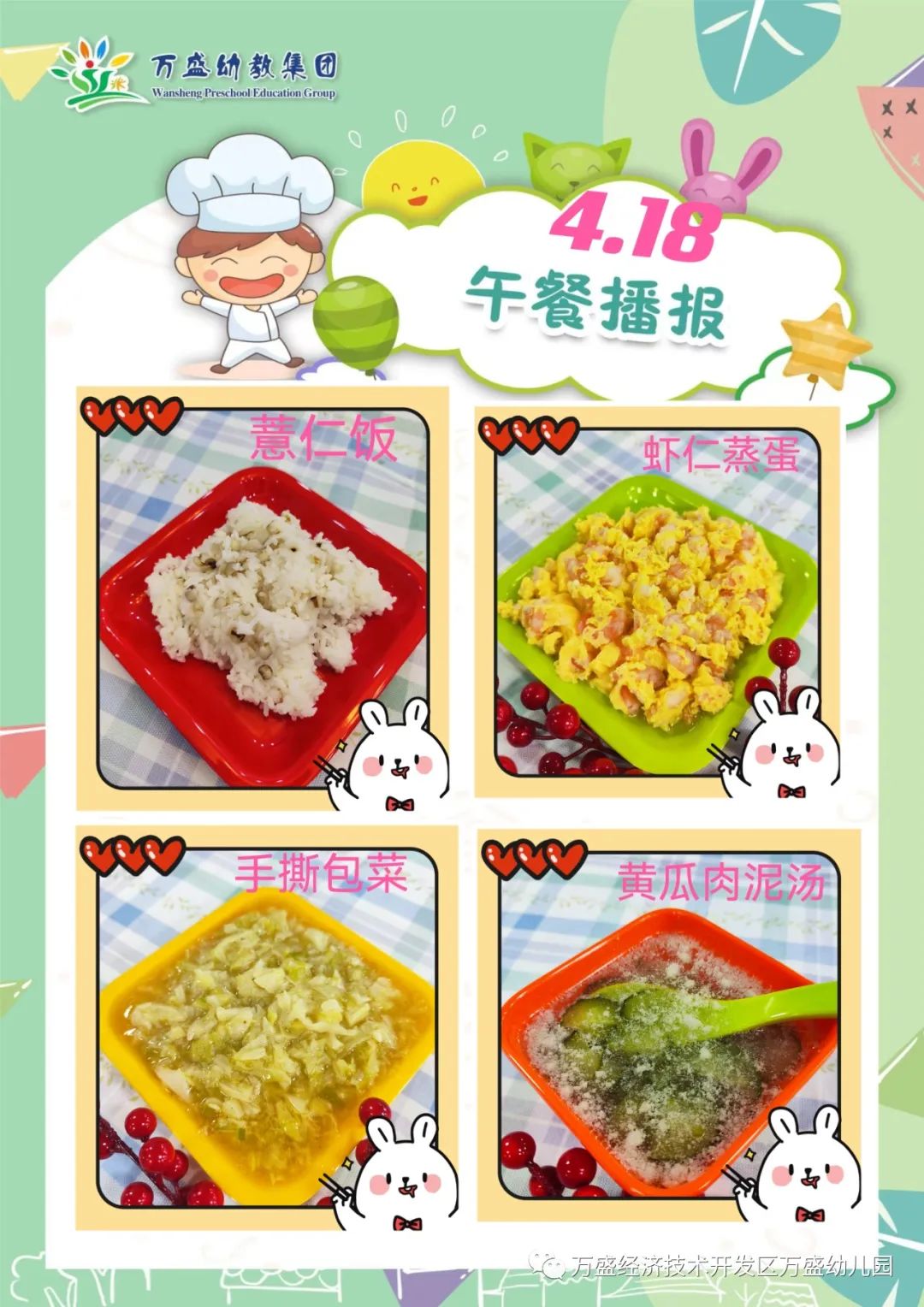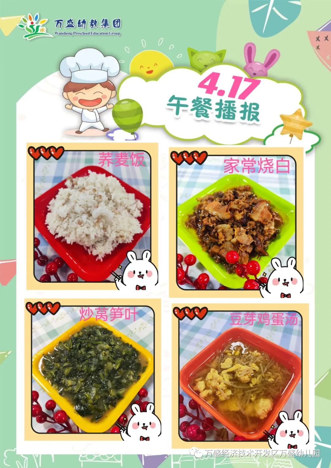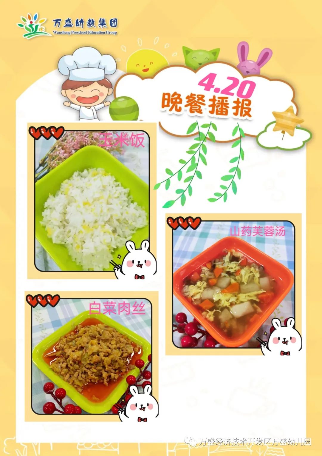 午餐:绿豆饭、蜜汁鸡翅、鸡蛋烩玉米、白菜肉丝汤