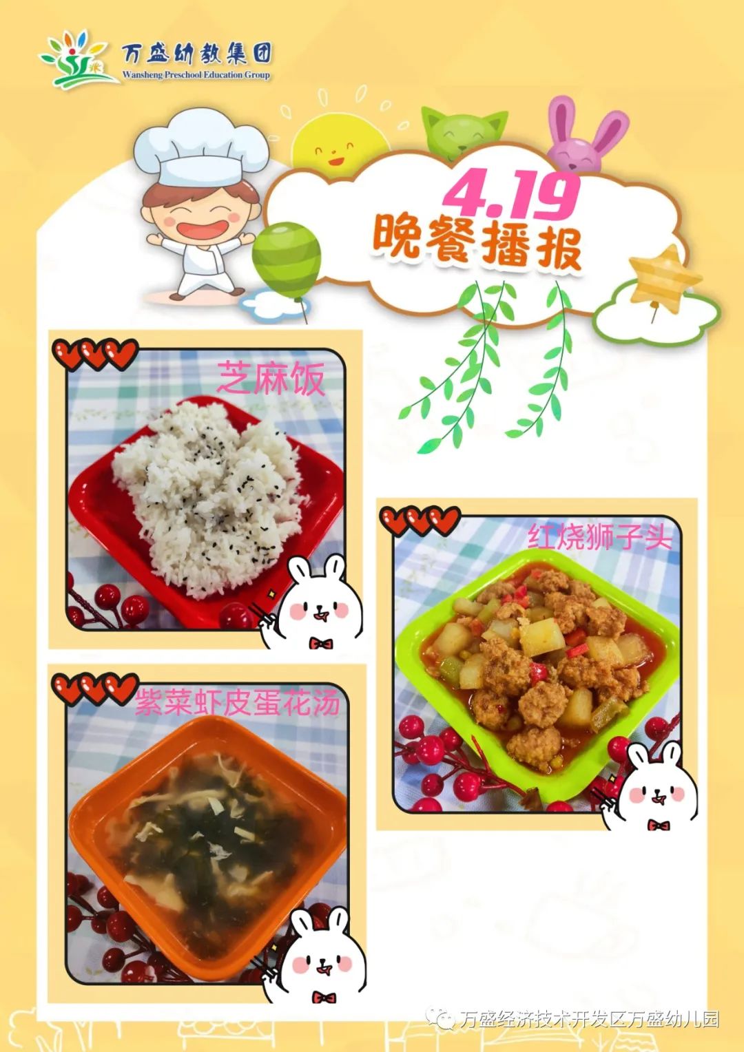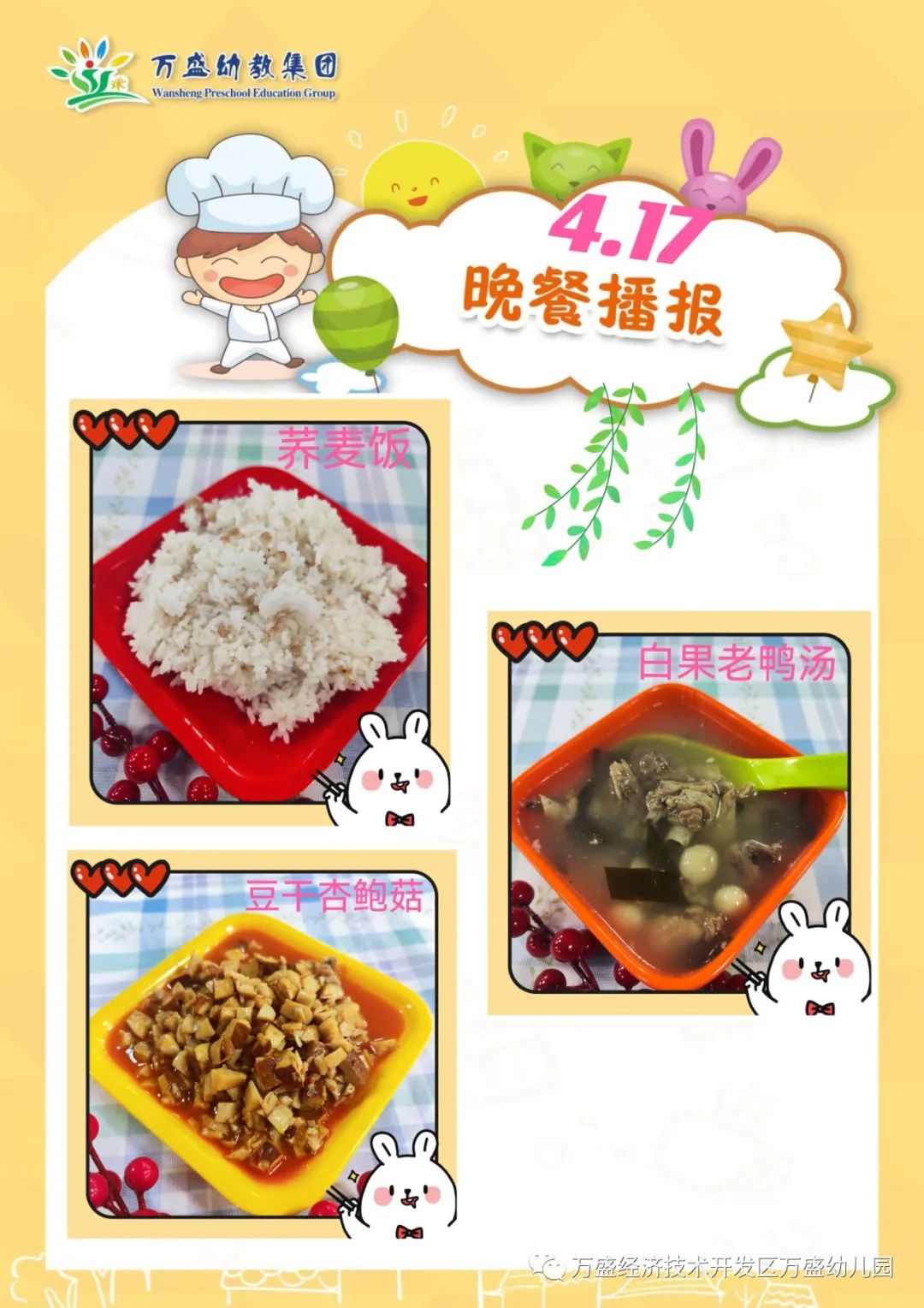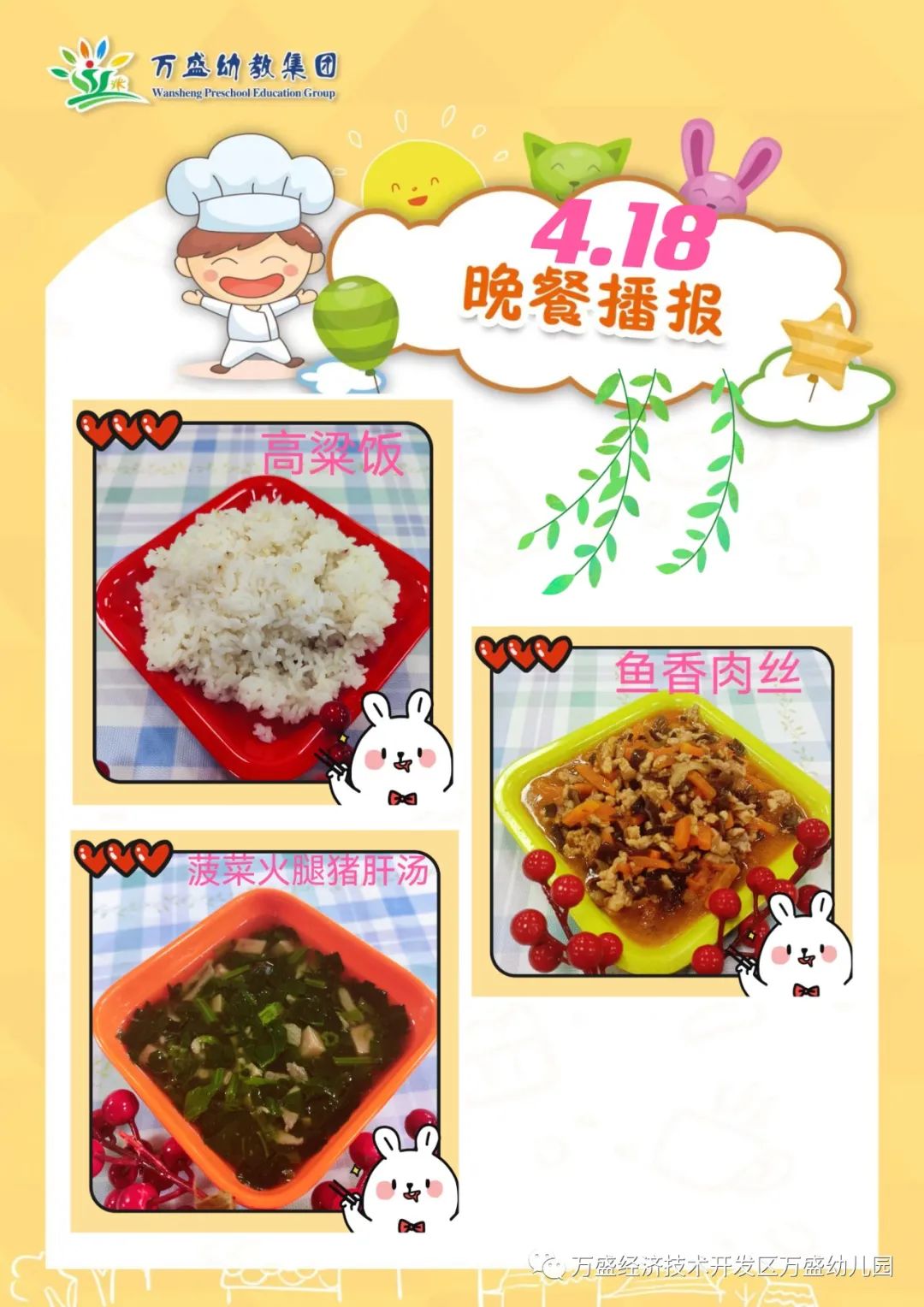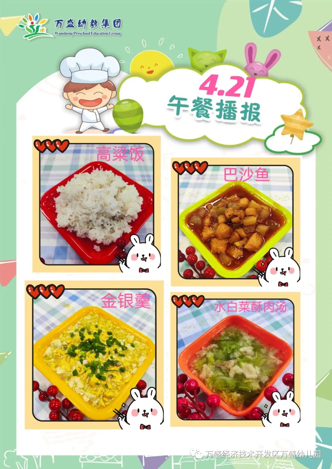 午餐:绿豆饭、蜜汁鸡翅、鸡蛋烩玉米、白菜肉丝汤