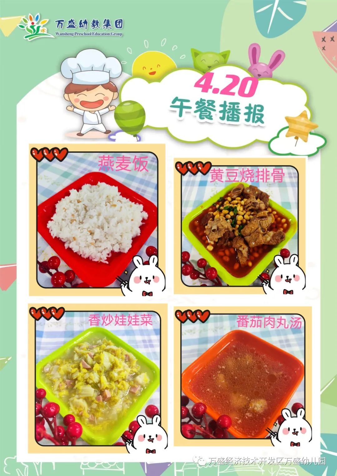 午餐:绿豆饭、香菇烧排骨、番茄炒鸡蛋、青菜丸子豆腐汤