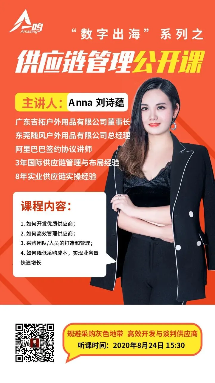 8月24日下午15:30,我们邀请到拥有多年供应链管理实战经验的Anna老师带来一场限时免费的“供应链管理之道”直播课。