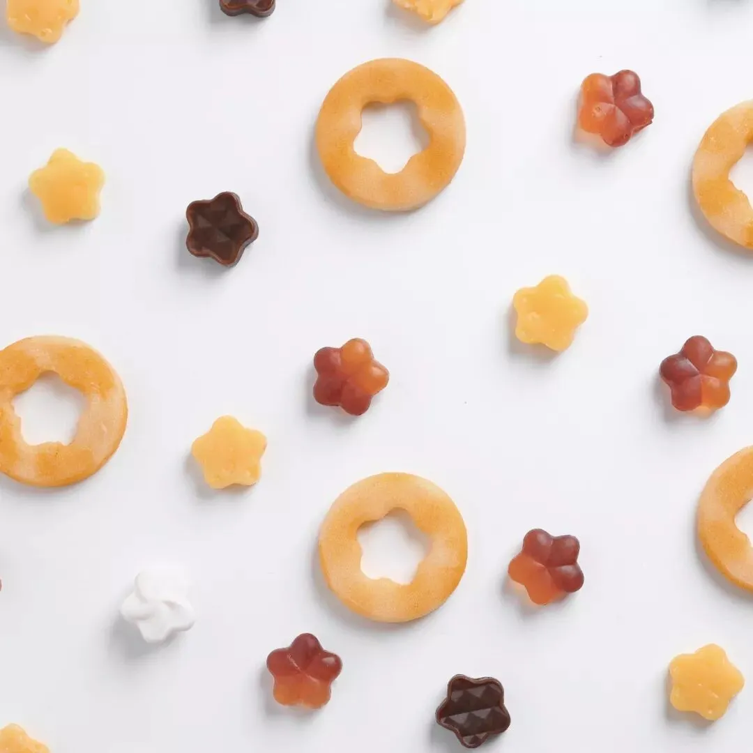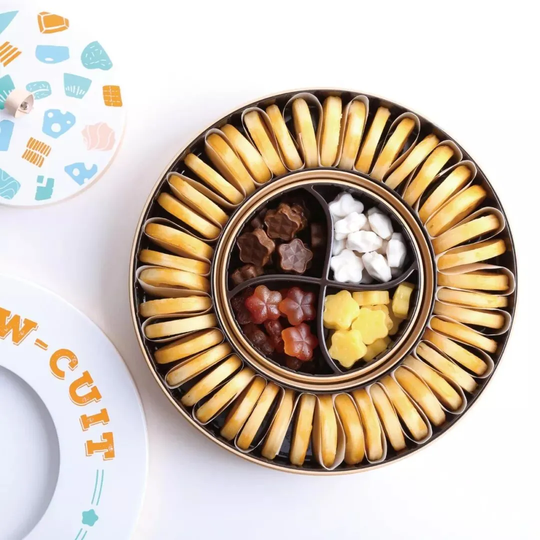 拼图饼干提供了一种新颖的零食搭配方式,将不同种类的零食组合在一起可以在吃的时候带来不同以往的味觉体验。试想一下软糖和饼干在一起吃是什么口感?拼图饼干中包含了四种平时常见的零食:巧克力,软糖,奶酪,奶油。这些单独的零食被设计成五角星的形状,它们可以被直接吃掉,也可以将这些零食塞入饼干的中心的洞中,与饼干一起搭配食用,体验不同的零食和饼干一起搭配时的有趣口感,在不断尝试搭配方式的过程中增强了零食之间的互动关系,也让休闲时光的变得更加新奇而令人享受。包装分为内外两层,四种不同口味的零食被装在中间的圆盒中,圆盒可以被提起与外侧的盒子分开,而饼干环绕在外侧的环形盒子中,数量与中间的零食口味是相等的。