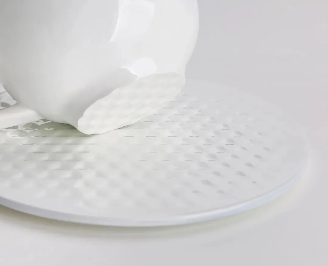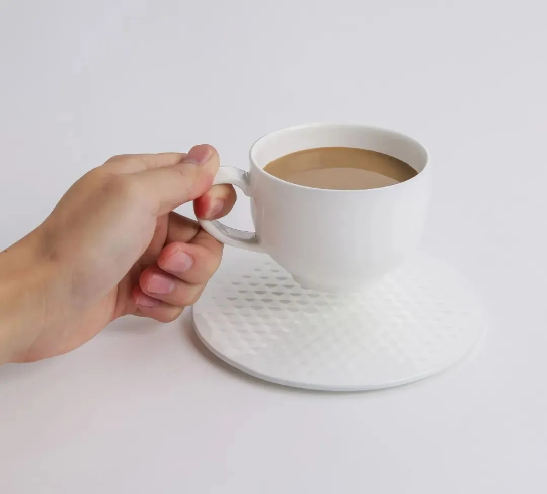 咖啡杯与咖啡碟总是相互配套的使用。《杯与碟》改变现有的造型,借由视觉和触觉去体现这种契合与配套:在彼此接触面设置凹凸纹理,从视觉上具有一致的装饰感,而在随手放置时,纹理能够起到一定稳定放置的作用,从而带来一种新的使用体验和感受。