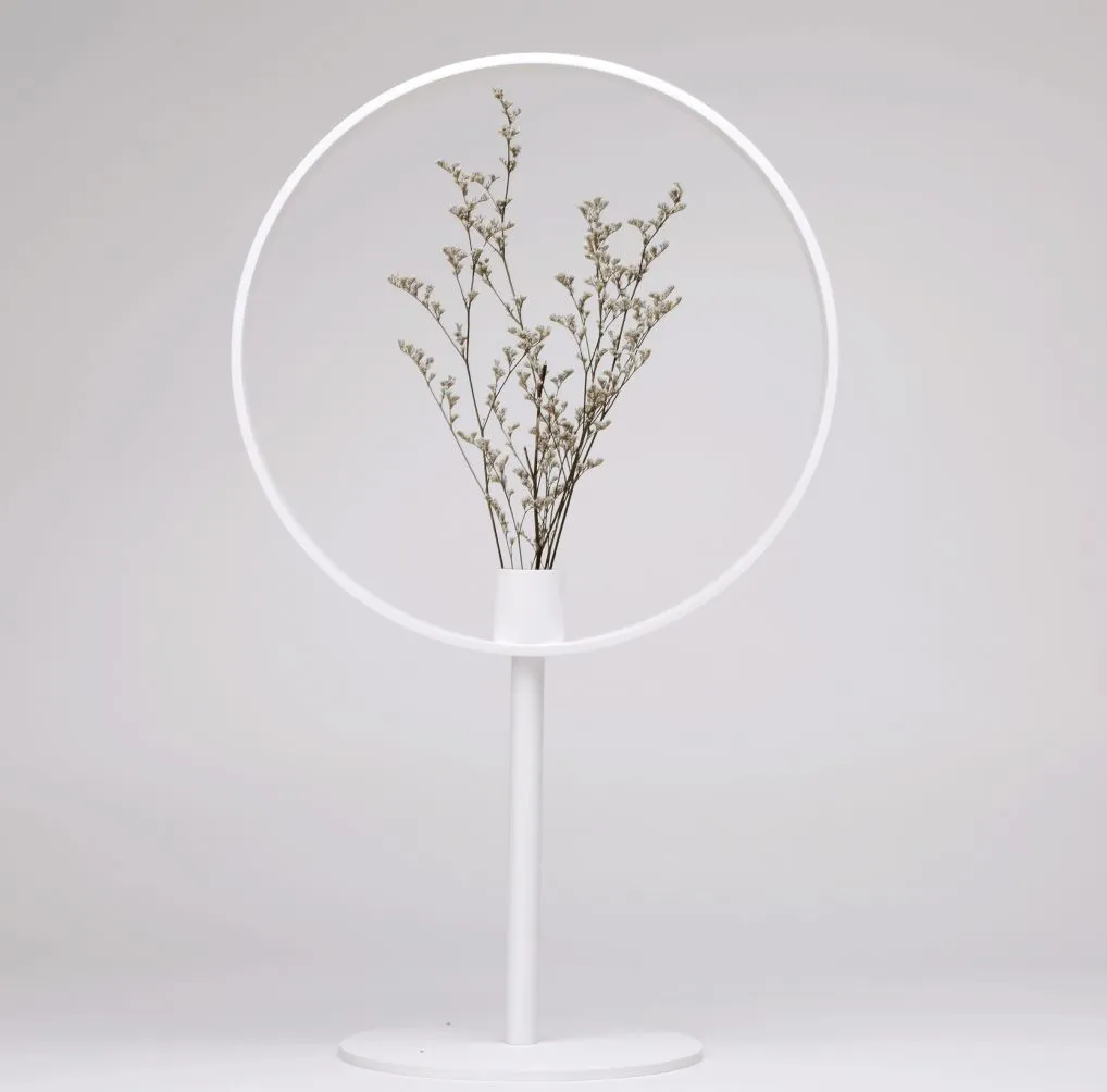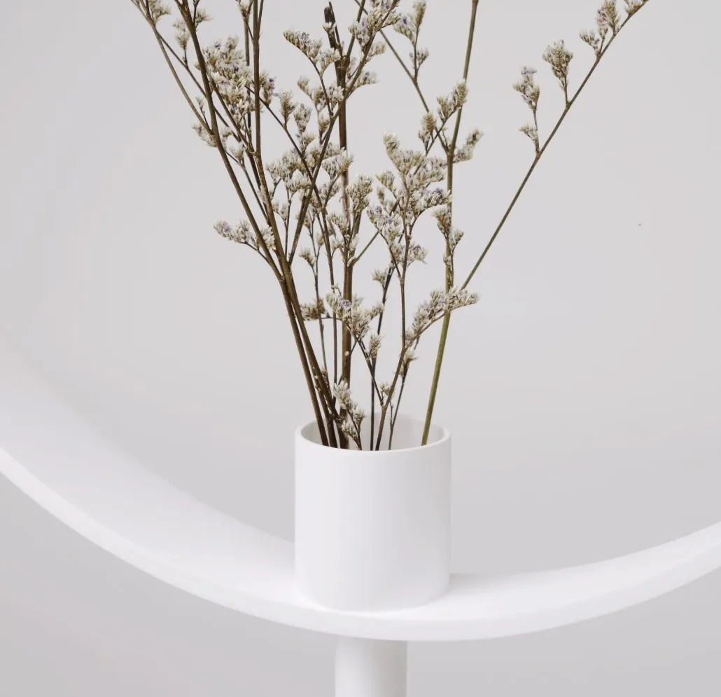 根据人对物体形状的知觉规律,在花瓶顶部设置圆环并且将瓶口部分进行物理放大,制造一种花被放大的视觉效果,即使事实上它并没有被放大,也仿佛能够把花看的更仔细了。