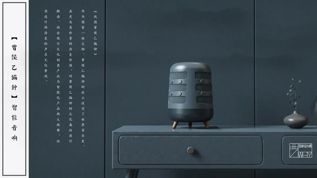 《战国曾侯乙编钟》作为国家一级文物,它的出土改写了世界音乐史,具有珍贵的历史价值,对曾侯乙的文化属性进行解读,将人工智能技术融入文创产品,利用设计将编钟和蓝牙音箱结合,重现历史的声乐文化。