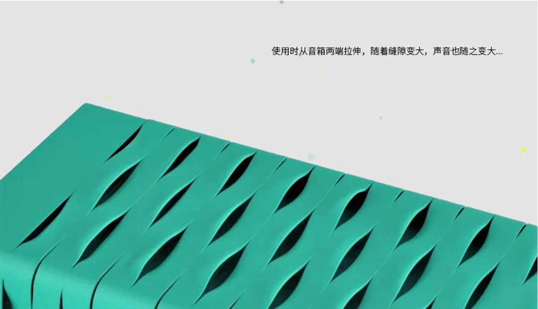 通过对剪纸工艺的了解分析,选取了一种阵列镂空的剪纸方法,结合其随意拉伸的特性,表面采用硅胶材质,在音箱的控制方式上进行创新,设计一款由左向右拉伸控制音量的蓝牙音箱,声音随着缝隙大小而改变,巧妙的将传统文化融合其中,在使用产品的同时也能感受剪纸艺术的美。