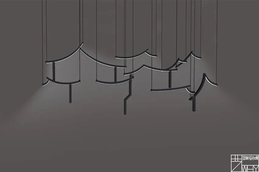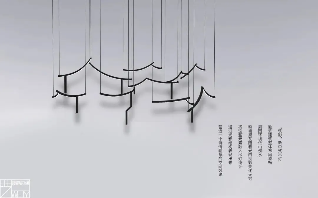 “筑影”新中式吊灯的灵感来源于徽派建筑,徽派建筑整体布局流畅依山傍水,给人的第一映像就像是一幅水墨画,粉墙黛瓦随着光的投影变化无穷,整体构造和谐流畅,配色简单清雅、造型独特。将这些建筑元素融入在灯具设计中,通过光影、结构表现出来。营造一个诗情画意的空间效果。每个灯具错落不一,简约的风格中多了一些趣味。